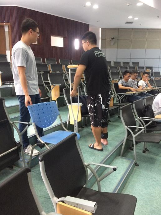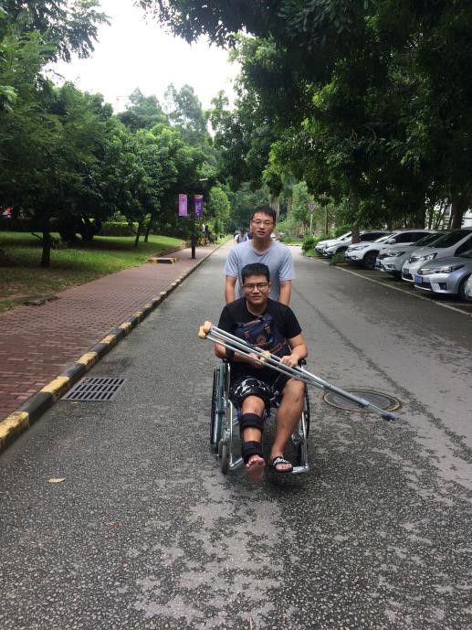 坐在轮椅上的这名同学叫刘昀,是机电工程与自动化学院机械工程专业2017级硕士新生。入学前的暑假,刘昀因为打篮球意外受伤,导致右膝韧带断裂、半月板撕裂,无法按期入学,遂向学院提出了延期报到申请,并于9月7日在重庆医科大学附属医院做了右膝韧带重建,半月板缝合手术。手术很顺利,但在很长一段时间内不能负重,出行基本要依靠拐杖或者轮椅。