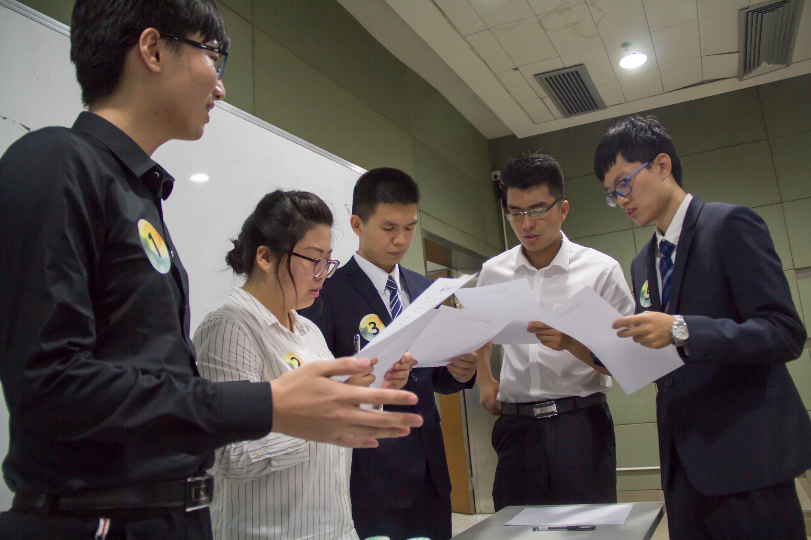 模拟招聘大赛经过简历筛选、初赛的激烈角逐后,十名选手进入决赛。决赛分为自我展示、小组讨论、评委提问三个环节。第一个环节中,每位选手都以不一样的风格和形式将他们的个人成就、学习能力、性格特点等展现得淋漓尽致。第二环节小组讨论,选手与观众同时拿到题目开始审题与思考,随后赛场上的选手进行了有序的发言并进行了激烈的讨论,每组由一名代表进行总结发言。评委们认真地记录他们的表现。在最后的评委提问环节,评委向各位选手一对一提问,考验选手的应变能力、抗压能力、逻辑思维能力。在此环节中,评委也对他们的自我介绍和小组讨论中的表现做出了详细的点评,使选手们清晰地认识到自身的优点和欠缺的地方,也使在场观众受益匪浅。