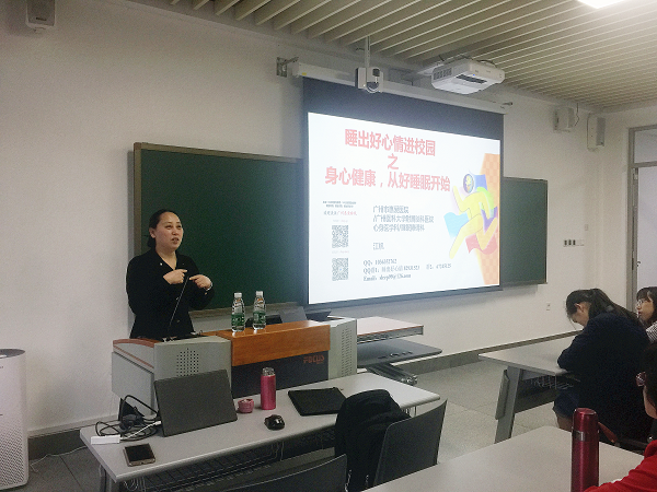 哈工大(深圳)宣(符方雄、王华/文 符方雄/图)为帮助解决校区广大师生睡眠健康困扰,受校区学生工作处邀请,广州医科大学附属脑科医院睡眠障碍科副主任医师江帆教授于3月24日下午15:00在我校T5205作了主题为“身心健康,从好的睡眠开始”的心理讲座。学生工作处心理咨询师华丹担任讲座主持,来自不同年级不同专业的50余名学生聆听了此次讲座。