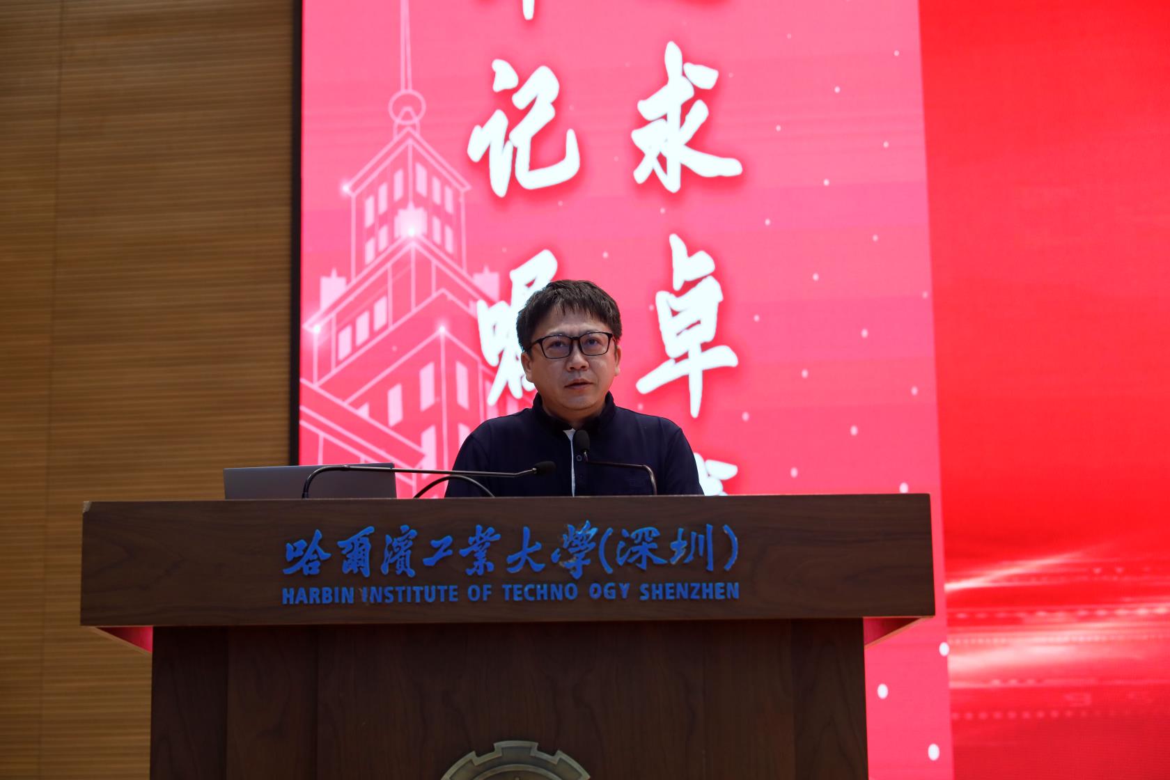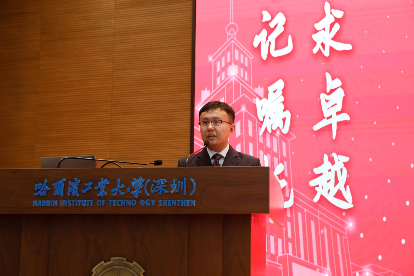 大会第一项,全体师生起立,奏国歌。礼毕之后,电信学院党委书记田佳俊老师代表院党委全体老师,向2020级新同学们表示热烈的欢迎和衷心的祝贺。他深情回顾了已有百年的哈工大的光荣历史,介绍了哈工大(深圳)第一批毕业本科生的就业去向,激励新同学们像优秀的学长学姐们学习,接受百年工大的优质教育,传承百年工大的爱国精神,秉承我院优良传统,薪火相传,砥砺前行,实现所有美好的期望。
