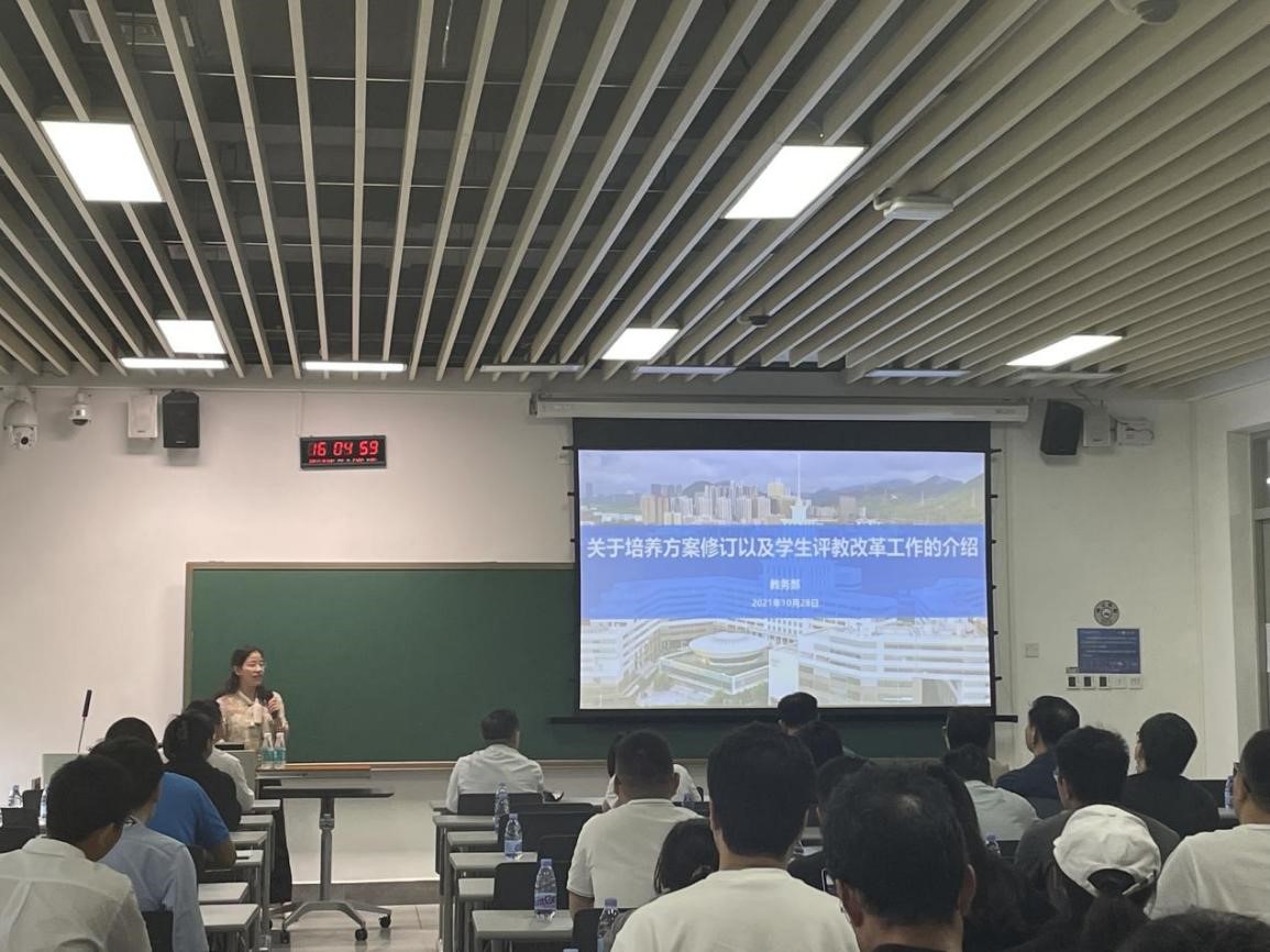 教务部副部长邹虹在会上详细解读了教务部关于培养方案修订的指导精神以及评教改革工作事宜,使学院教师对本科生、研究生培养方案的修订要求、第三方评教规则等有了深刻的理解。