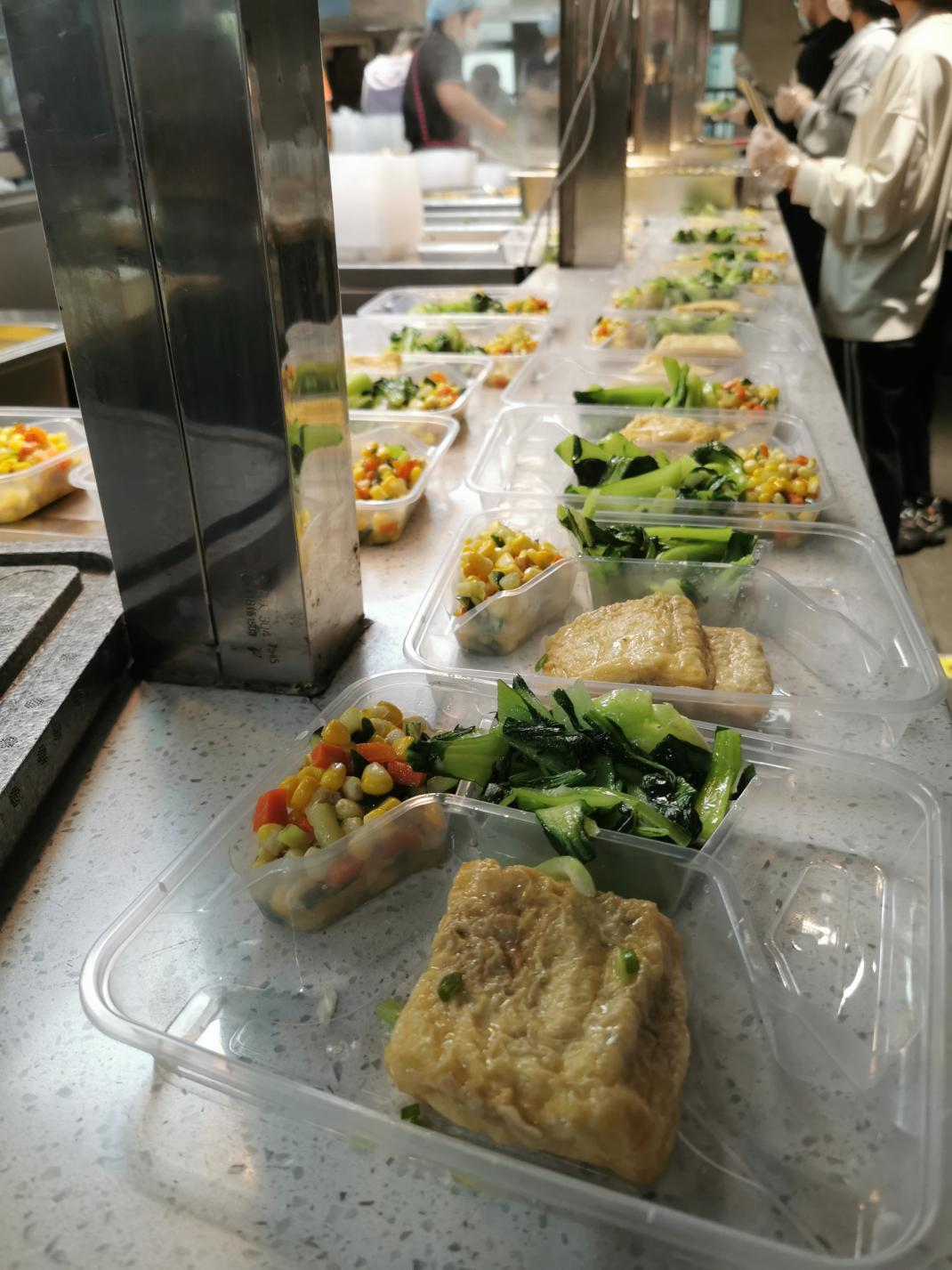 从第一天的略微生疏,到后来的有条不紊、配合默契,一个小小的送餐任务也是需要明确分工,合理配合。首先要统计核算准确餐盒数,特别注意精细化配送不同类别餐食。一个小分队负责打菜盖盒,一个小分队负责装袋,一个小分队负责清点数目与装车,最后是运送小分队优化路线送出餐食。经过几次磨合,送餐小队高效运转,餐食以越来越快的速度准确送到学生的门口。一周的时间,实验中心的老师们一共送出了两千六百多份餐食,共有161人次的老师参加了送餐工作。