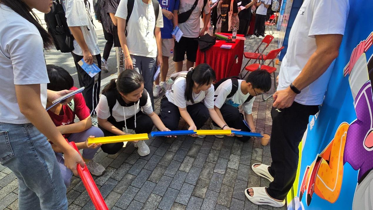 “珠行万里”团队挑战区人声鼎沸,五人一组的同学们齐心协力完成小球传递任务,加油声此起彼伏。协作、沟通与默契在游戏中得以升华,让大家体会到团队协作的力量。