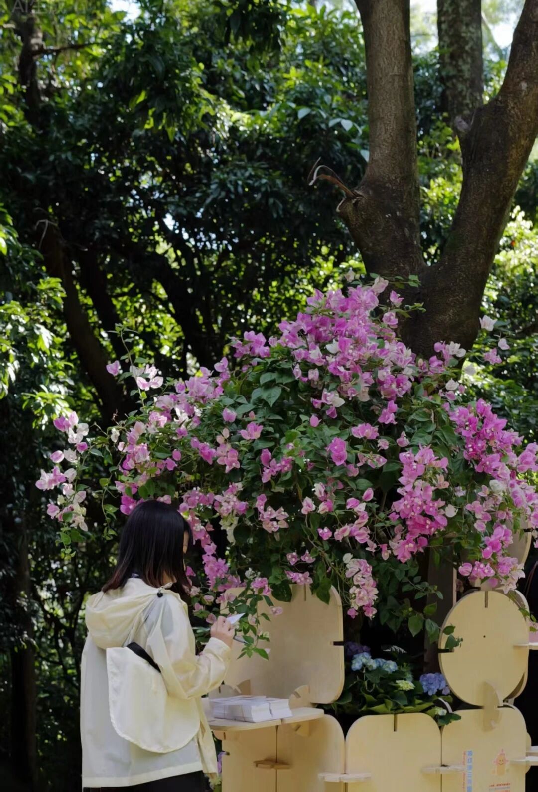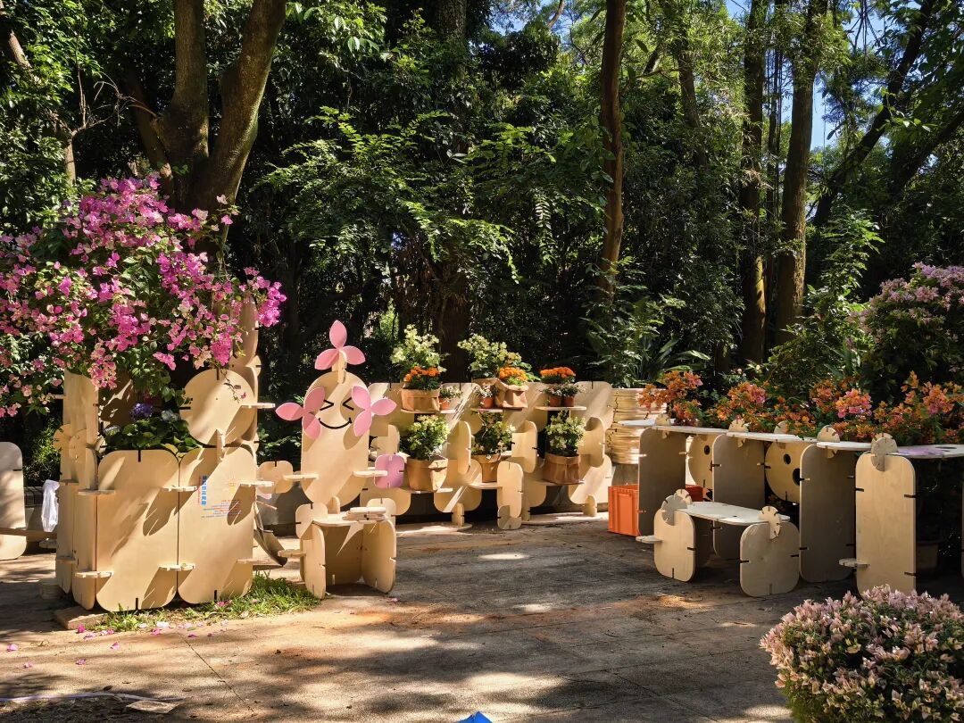 该作品聚焦现代都市生活中的情绪疏导需求,创新采用模块化设计,将复杂结构拆解为可自由组合的基础单元。通过拼插组合,构建出集科普、休憩与互动功能于一体的多样化场景,如“梅烦恼”情绪树洞与“芒里看花”休闲区。游客不仅能在景观中了解花卉知识,还能亲手参与模块的自由拼搭,在此营造出一个承载情感、促进人际交流的微型花园。