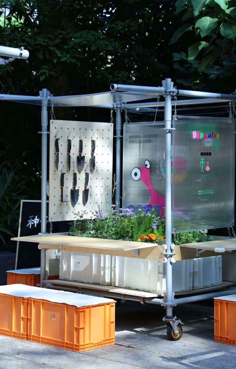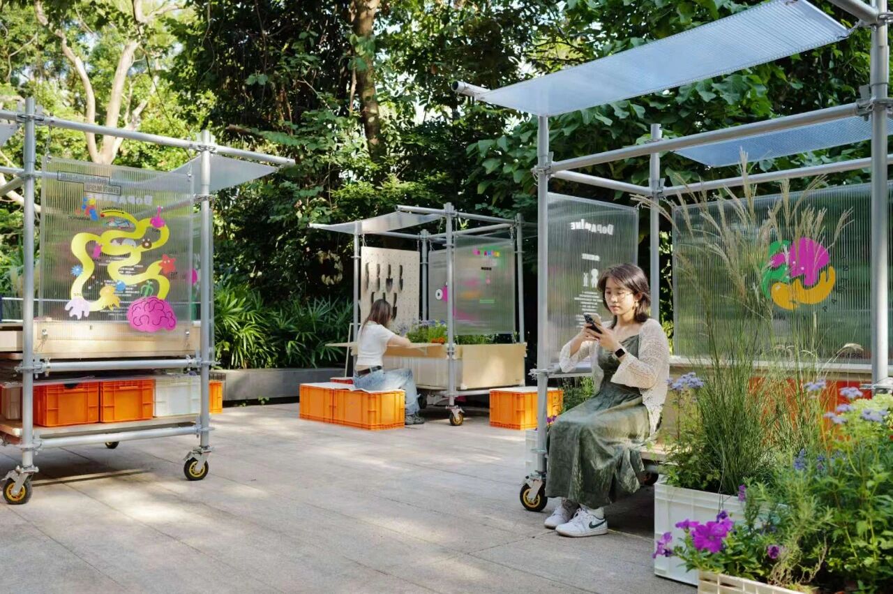 伴随城市生活节奏加快,人们的心理压力不断累积。尽管优质的花园景观有助于舒缓情绪,但在高密度城市与社区中,公共空间有限,既有花园难以覆盖并服务每一位居民。为此,设计团队构想了一种不占用固定场地、可随时停驻的“流动景观”花园,旨在通过简洁精巧的结构,快速营造丰富的生态体验,让自然与活动穿行于城市街巷,将生机与快乐传递至每一个角落。