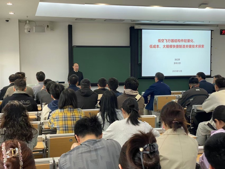 随后,孙以泽院士做客学术讲坛,为师生带来了题为《低空飞行器结构构件轻量化及低成本大规模制造关键技术探索》的精彩报告。报告指出,低空经济作为国家战略性新兴产业,其核心装备的制造长期面临高端工艺受限、自动化装备依赖进口等卡脖子难题。针对这一挑战,孙以泽院士系统阐述了团队在结构轻量化、气动一体化设计及三维纺织复合材料数字化性能仿真等领域的创新成果。他介绍了团队如何通过建立高保真建模方法,攻克了从微观纤维束到宏观结构件的性能预测难题,为复材设计提供了全新的数字化解决方案。