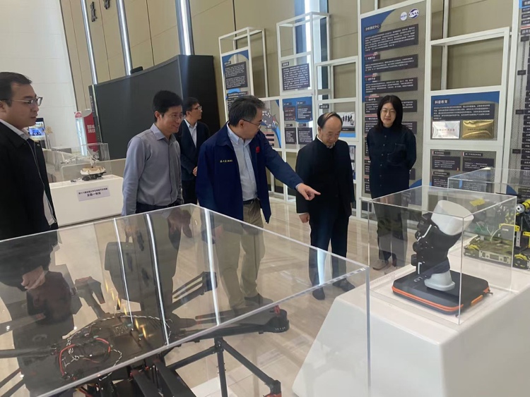 下午,孙以泽院士一行参观了学校实训中心及实验室。在学生创新成果展示区,孙以泽院士一行听取了关于全国大学生智能汽车竞赛获奖作品及学生自研无人机的情况介绍。他仔细察看了展品结构,并向现场指导教师详细询问了学生团队的科创机制与技术攻关情况。孙院士对我校“以赛促学、以研促教”的实践育人成效表示赞赏。此外,在实地考察了相关教学与科研实验室的运行情况后,孙院士对学校优越的实验环境及完善的科研配套设施给予了充分肯定。