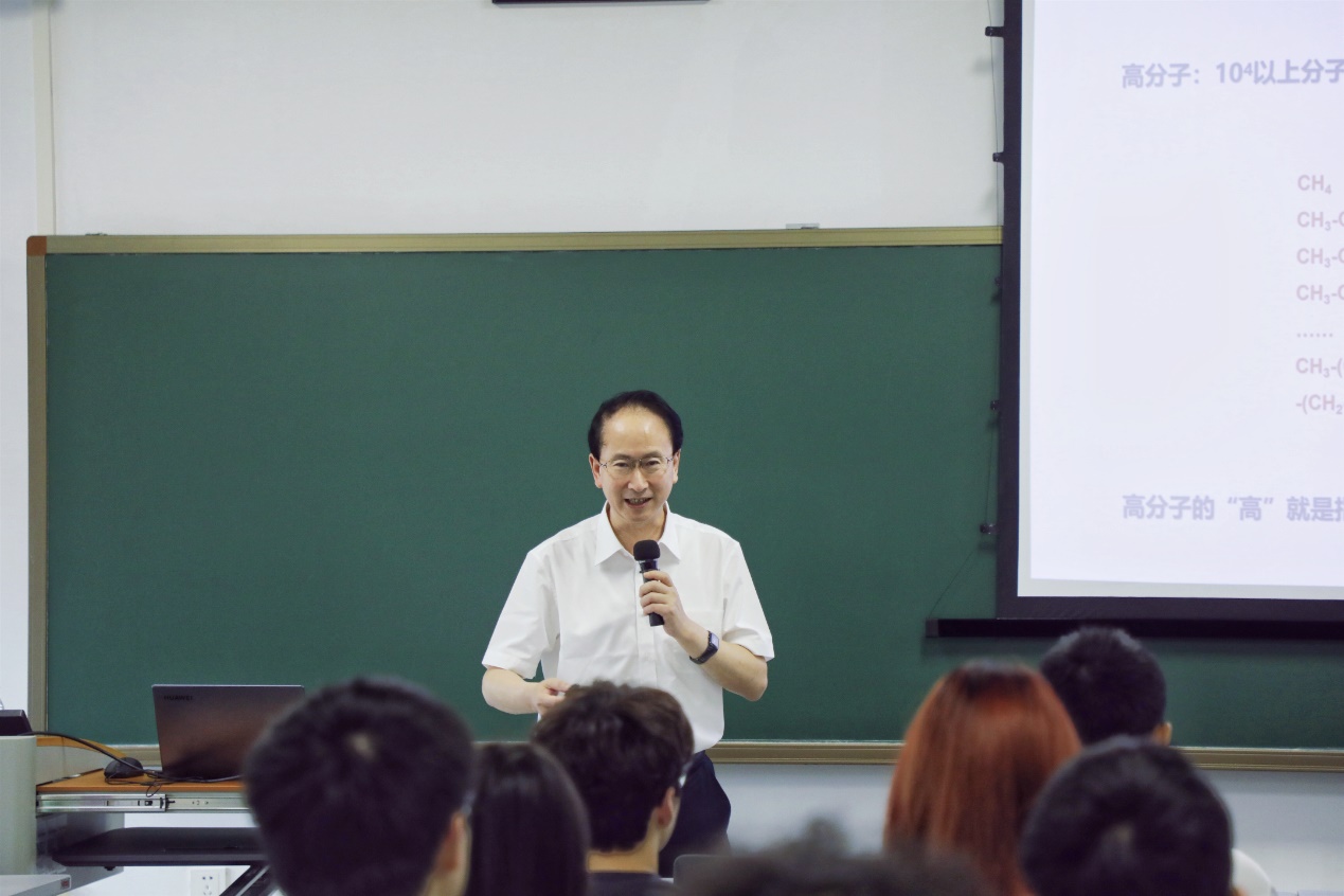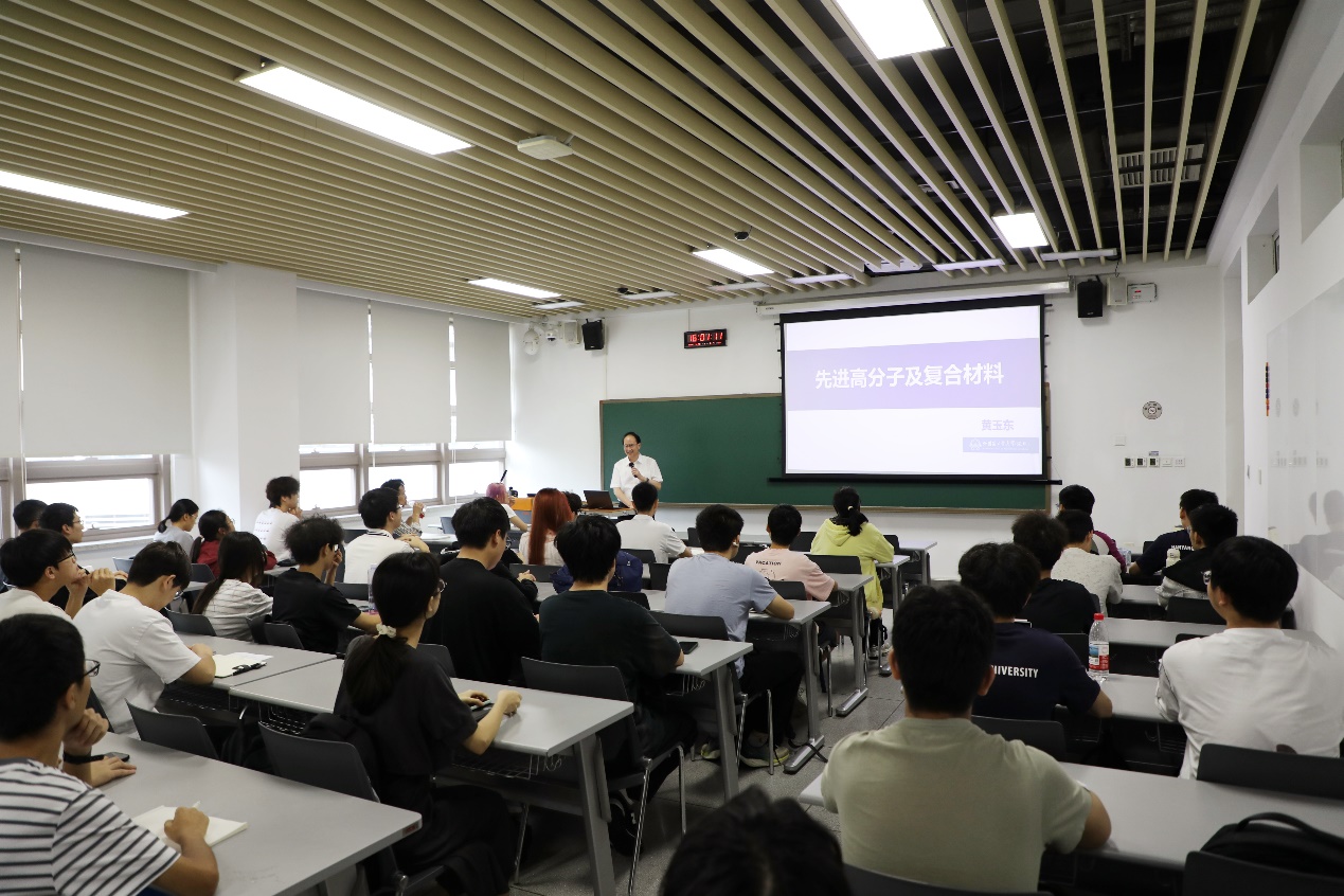 黄玉东从材料发展史切入,回顾了高分子材料从基础研究到高端应用,再到当前进入复合材料为主导的新阶段的演进路径,并结合产业实例生动展示了高分子材料的广泛应用与关键突破。一组组数据吸引了同学们的目光,不禁为我国科技快速发展及哈工大的“硬科技”连连点赞:在航天领域,黄玉东团队研发的耐300℃极端温差的复合材料取芯组件,为嫦娥五号、六号月壤采样任务提供了关键支撑。在航空领域,碳纤维增强复合材料占比已超50%,实现机身减重20%以上,运载效率显著提升。在新能源领域,我国最大直径170米的风电叶片也依托高分子材料实现轻量化与高强度,发电效率提升近30%……