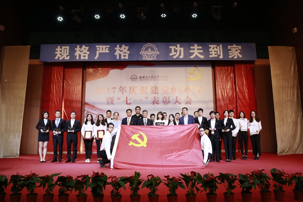 在奏唱国歌后,姚英学宣读了《中共哈尔滨工业大学(深圳)筹建办公室临时委员会关于表彰优秀党支部、优秀共产党员、优秀党务工作者和优秀学生党支部书记的决定》,行政第一党支部、机电工程与自动化学院教职工党支部、2015硕环境学生党支部、2015硕工商管理学生党支部、2016硕应用经济学学生党支部荣获“优秀党支部”称号;行政第一党支部原书记李晓虹等10人荣获“十佳共产党员”称号;电子与信息工程学院党支部书记田佳峻等3人荣获“优秀党务工作者”称号;行政第一党支部宣传委员周阳等80人荣获“优秀共产党员”称号;2016硕通信学生党支部书记周晓荣等10人荣获“优秀学生党支部书记”称号。