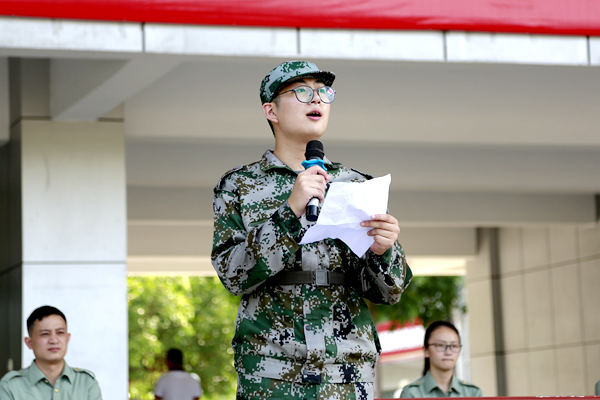 2017级机电工程与自动化学院本科新生、军训三连三班徐朕燃作为参训学生代表发言。他代表全体新生保证,必将保质保量地完成军训任务,发扬“流血流汗不流泪,掉皮掉肉不掉队”的精神,服从命令,听从指挥,展现南国工大人昂扬向上的精神面貌。