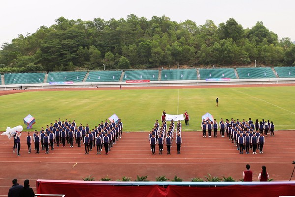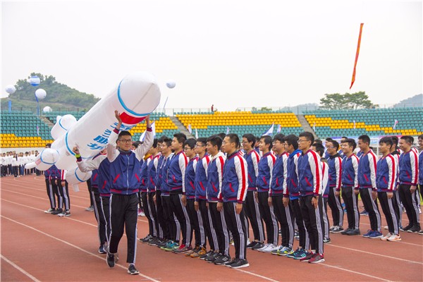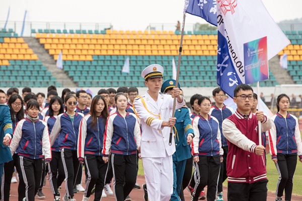 入场式上,由校区本科生组成的方阵精神饱满,高举“筑梦鹏城”的巨型火箭,不畏寒风,昂首阔步,通过变换队形摆出“HIT”的形状,展现了校区学子的青春风采和良好的精神风貌。