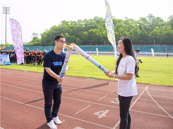 精彩的师生文艺汇演结束后,由各学院优秀师生代表担任火炬手,通过绕场一周接力跑步完成火炬传递环节。最后,由刘颖和张敏共同点燃本届运动会圣火。