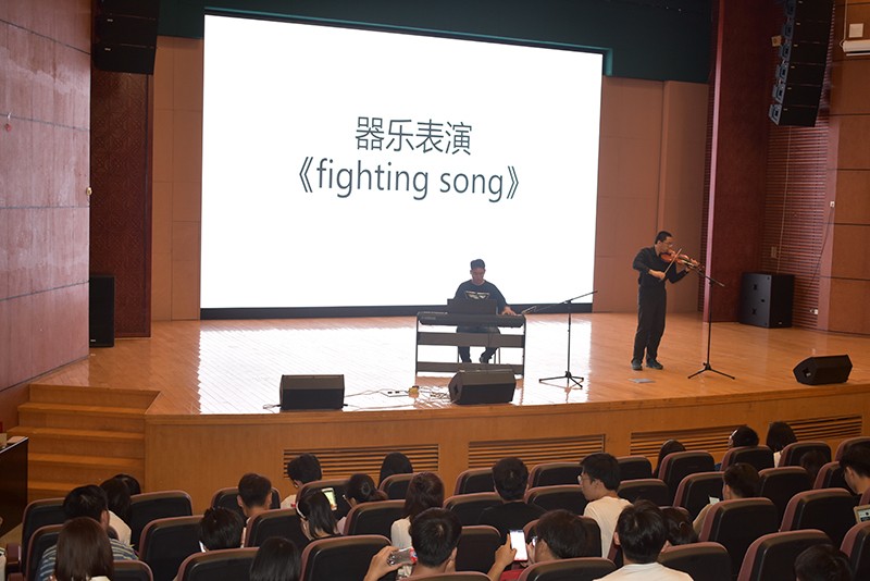 由校区学生艺术团带来的中场表演也精彩纷呈,相声《说方言》风趣幽默,逗得全场观众连连捧腹;钢琴小提琴合奏《Fighting Song》恢弘震撼,给紧张激烈的比赛增添了别样风情;抽奖环节令现场气氛越发热烈。