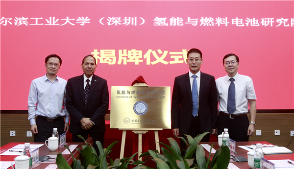 中广核研究院有限公司副院长舒睿,美国工程院院士Singhal,哈工大校长助理、校区常务副校长甄良,校区理学院院长仲政(从左至右)为氢能与燃料电池研究院揭牌