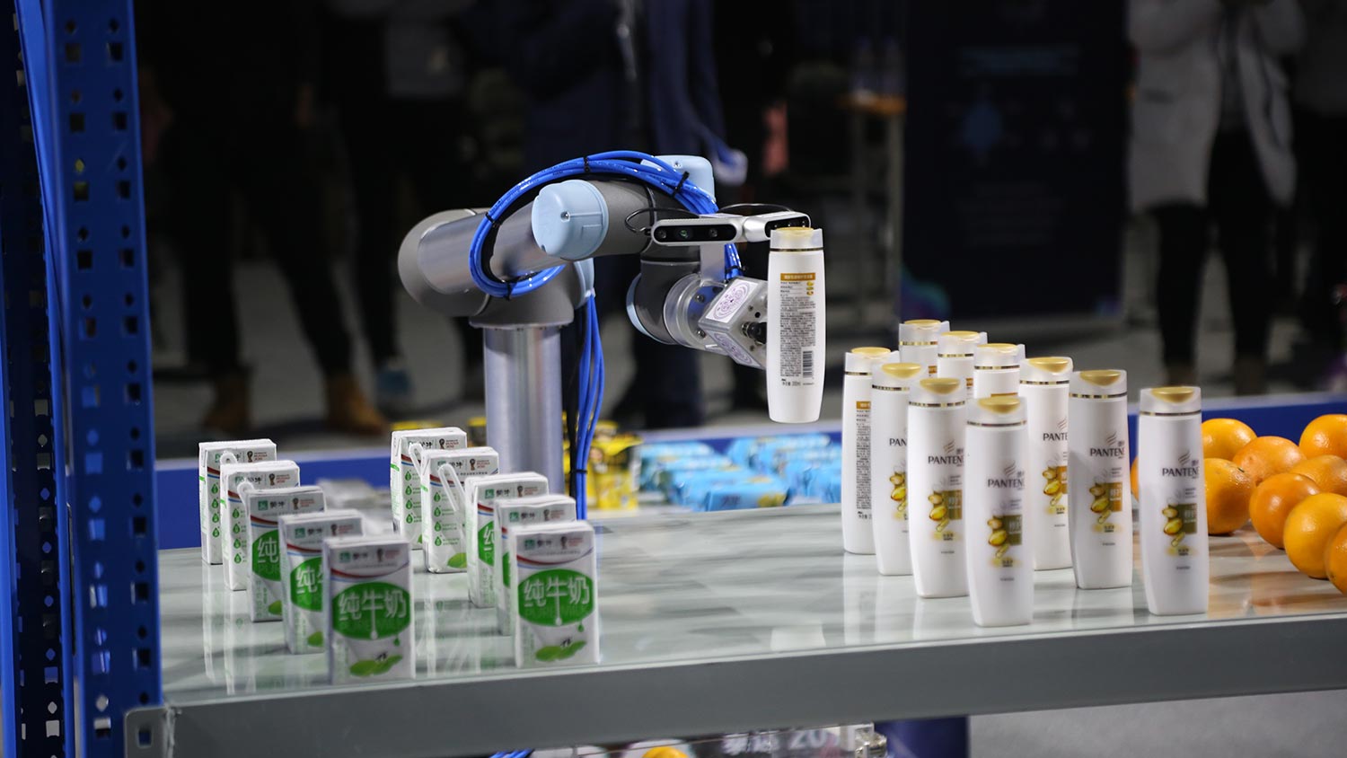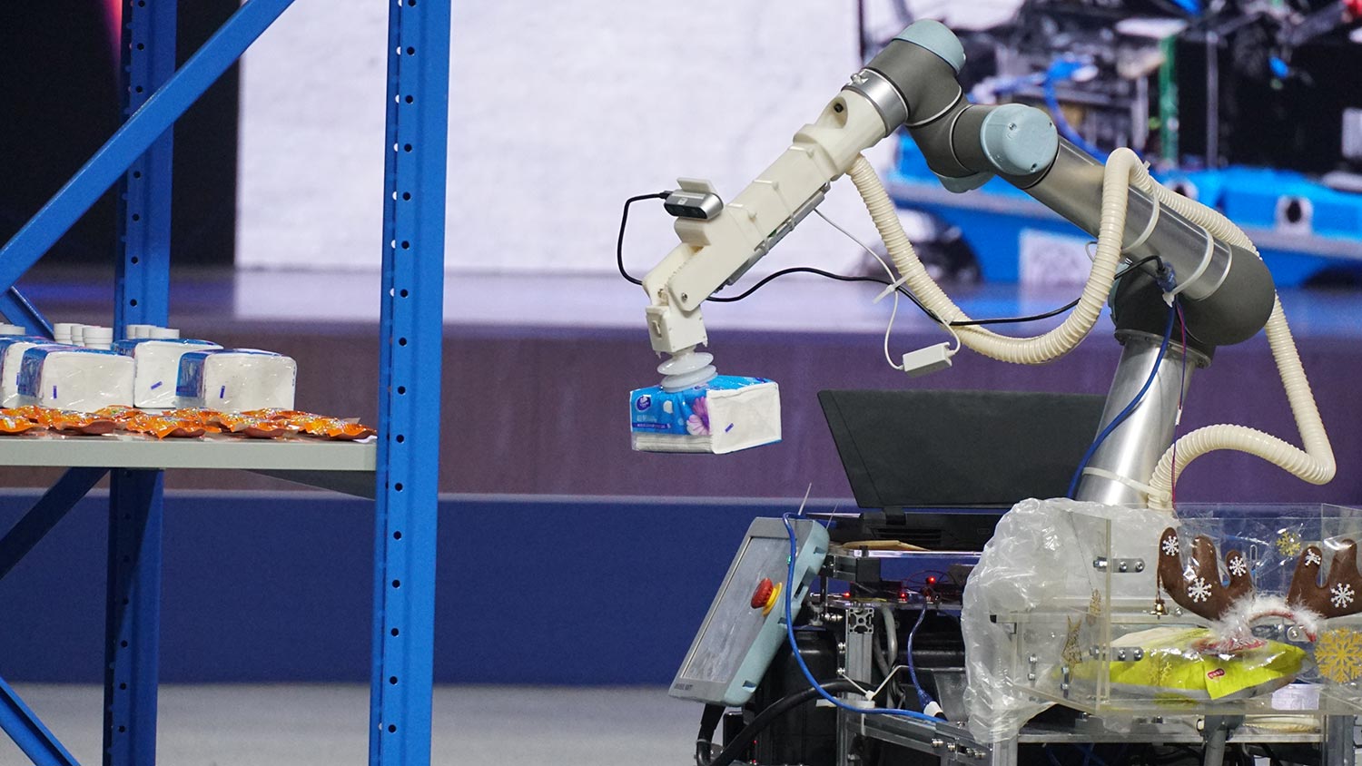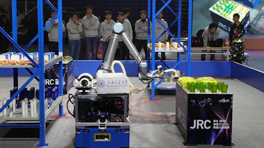 随着评委宣布总决赛开始,10支队伍分成两组在搭建好的智能仓储和无人超市实际应用场景进行首轮比拼。根据比赛赛制,机器人从起点出发,在没有任何标识物的前提下,自主移动至货架旁进行商品拣选并搬运、码放至指定位置。在20种品类、颜色、形状大小、光滑度、摆放方式等各不相同的商品中,机器人要准确、高效地选出其中10种,对于其视觉识别、抓取等多种复杂技术协同运作的整体性有着极大考验。同时,由于目标商品具有随机性,极大地刺激了选手的技术调整能力和团队协作能力。