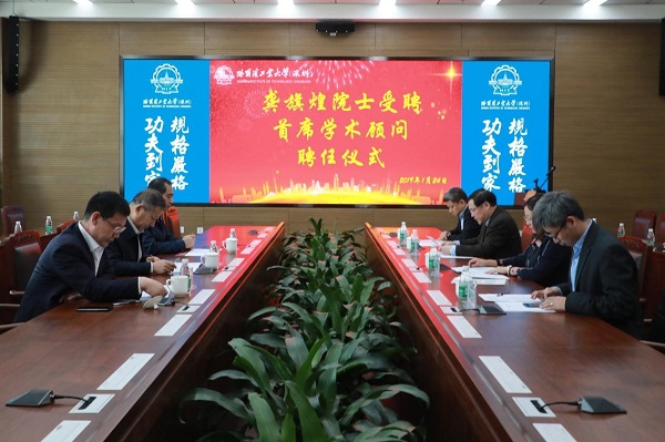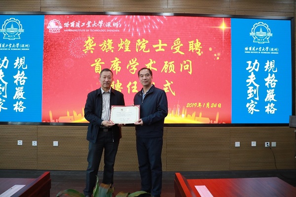 哈工大(深圳)宣 (李卉/文、图)1月24日,中国科学院院士、北京大学副校长龚旗煌教授受聘为校区首席学术顾问。中国工程院院士、哈工大校长兼哈工大(深圳)校长周玉为龚旗煌院士颁发聘书。哈工大校长助理、校区常务副校长甄良主持聘任仪式。
