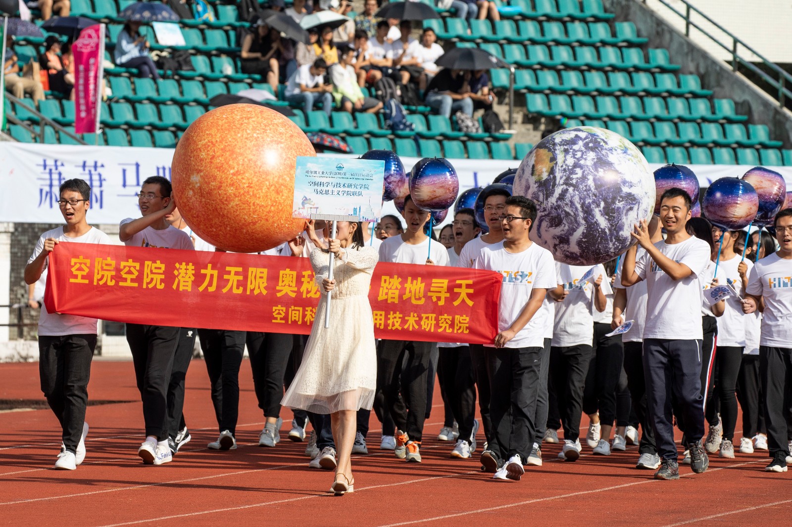 鲜艳的五星红旗、悠扬的歌声、嘹亮的口号,无不彰显着哈工大(深圳)师生昂扬的斗志和积极向上的风貌;卡通人物“小黄人”、“熊本熊”、“轻松熊”纷纷亮相,走得再远都要保留一颗童真的心;带着安全帽、喊着号子、唱着打夯歌的表演尤其让人印象深刻,萌萌的太空人迈着轻快的步伐牵动了全场师生的神经,伴随着《我和我的祖国》翩翩起舞点燃了全场的高潮。