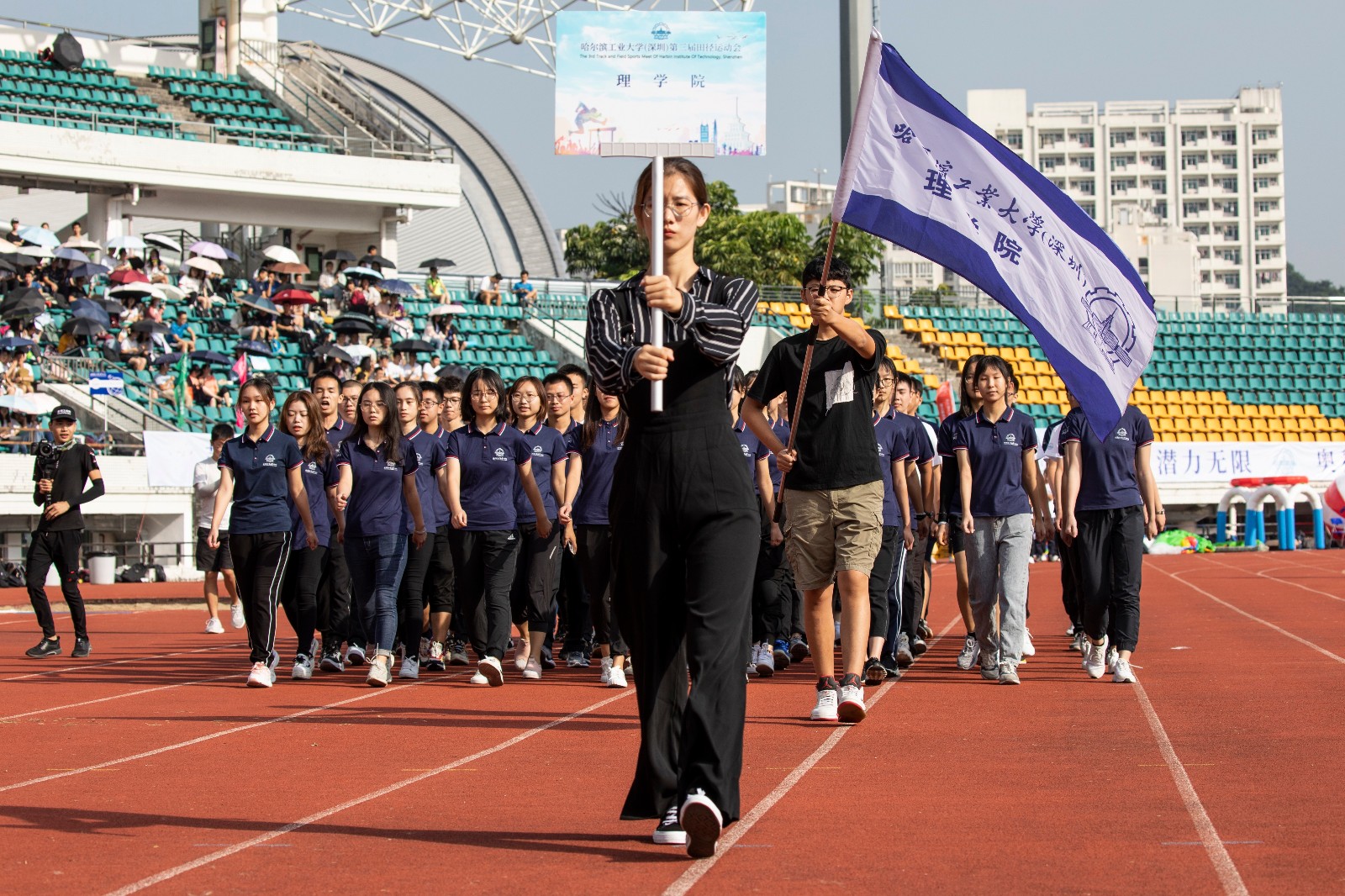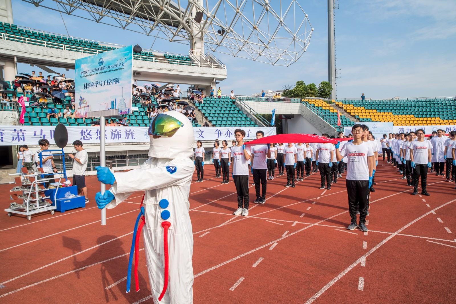 【哈工大(深圳)宣】(向碧霞、王艺霖/文 视界工作室/图)巨幅五星红旗飘扬在赛道,嘹亮的《我和我的祖国》歌声飘荡在体育场上方,朝气蓬勃的艺术团成员跳起街舞,跃跃欲试的运动员摩拳擦掌……10月18日,哈工大(深圳)第三届田径运动会在深圳大学城体育场开幕,来自各学院和行政部门的11支运动代表队共计1100余名师生参与了长短跑、跳高、跳远、铅球、趣味运动等项目的比拼,有腔有调。
