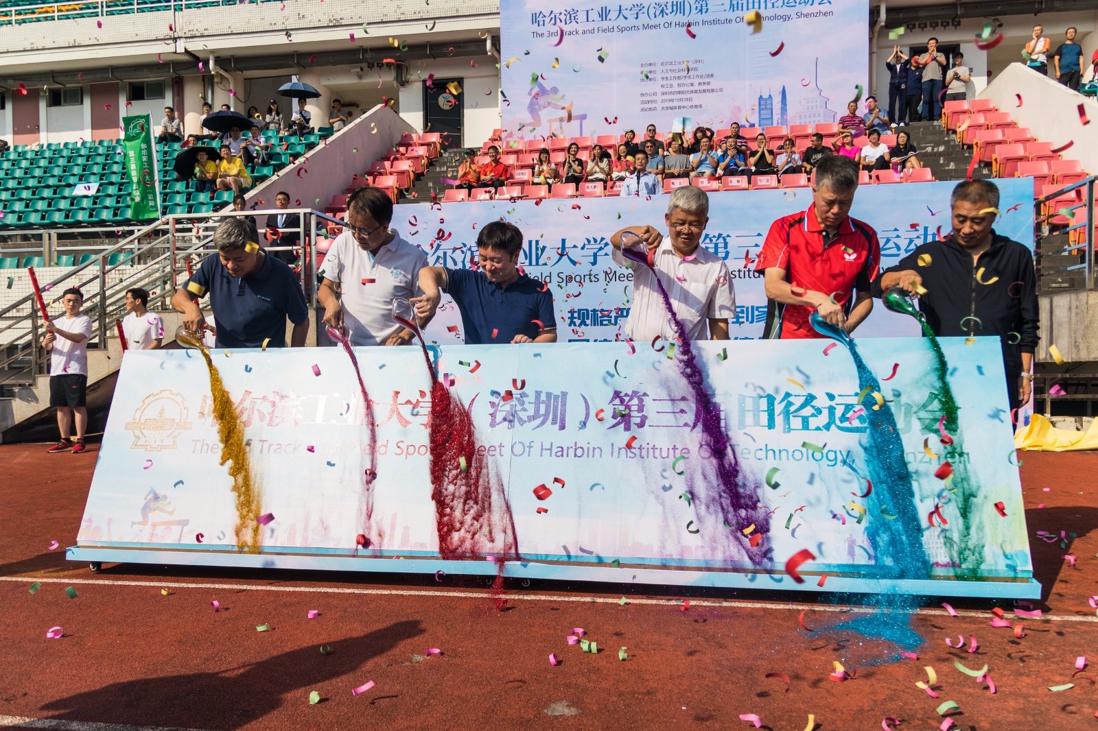 哈工大(深圳)校长助理韩喜双、马广富、梁大鹏,工会工作负责人张敏启动运动会鎏金沙
