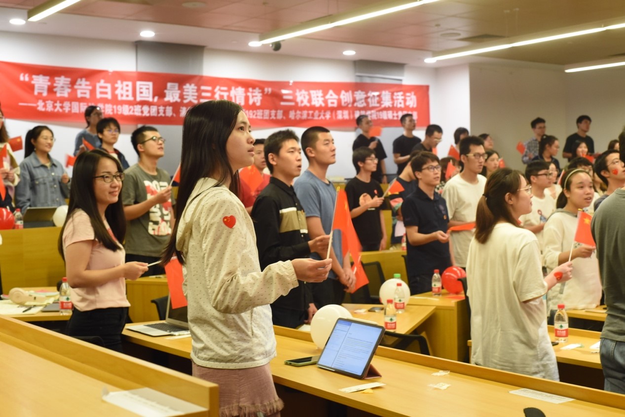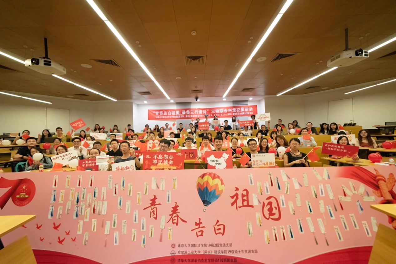 【哈工大(深圳)宣】(刘兵兵 蔡睿/文 戴茂林/图)近日,由哈工大(深圳)建筑学院2019级硕士生党团支部、北京大学国际法学院2019级2班硕士生党团支部和清华伯克利深圳学院2019级2班硕士生党团支部联合举办的“青春告白祖国,最美三行情诗”学生党团联合主题教育活动精彩落幕。活动中,同学们大开脑洞、一展才华,共同创造并朗诵“三行情诗”,向祖国母亲深情告白。