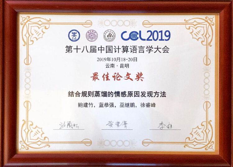 在近日召开的第十八届中国计算语言学大会(CCL 2019)上,哈工大(深圳)计算机科学与技术学院硕士生鲍建竹、蓝恭强、博士生巫继鹏和徐睿峰教授联合发表的论文《结合规则蒸馏的情感原因发现方法》从380余篇投稿论文中脱颖而出,荣获CCL 2019最佳论文奖。