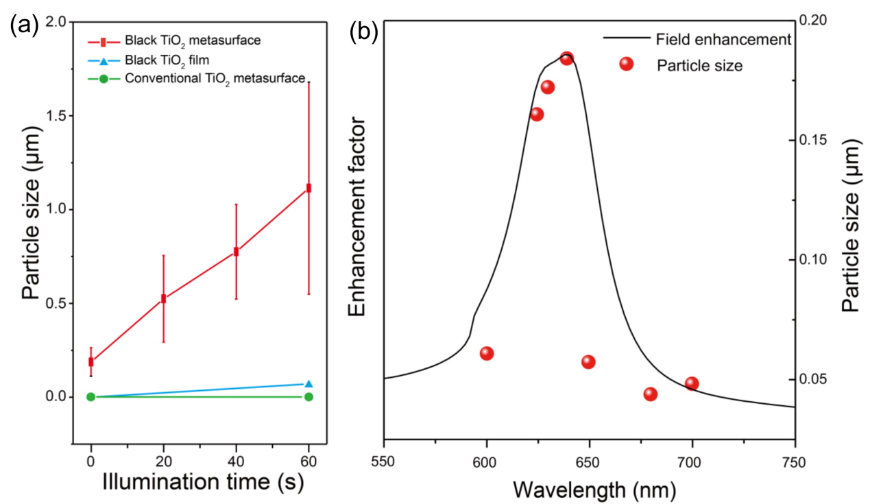 利用黑色二氧化钛超构表面对所设计波段的光场谐振增强作用来进一步提升黑色二氧化钛本身的光催化性能(图2a)。同时,由于二氧化钛超构表面产生的谐振增强峰很窄,超构表面对光催化的谐振增强作用只在设计的峰位附近最强,而在其他波段几乎没有增强(图2b)。