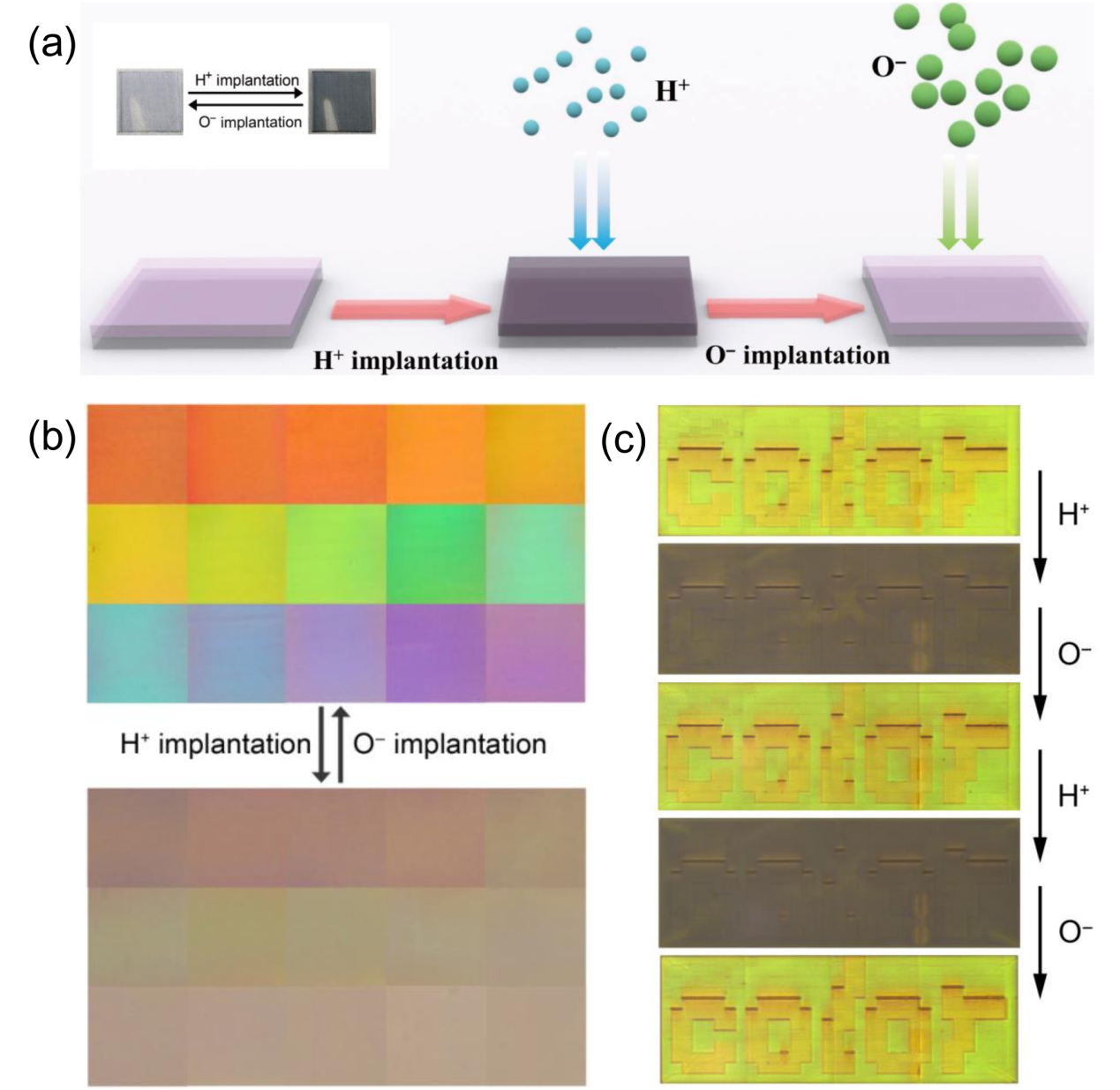 该技术可以几乎无损耗且可逆地将二氧化钛转化为黑色二氧化钛(图1a),而不会破坏其内部纳米结构。当二氧化钛转化为黑色二氧化钛后,其在可见光内的吸收会显著提升,从而使二氧化钛超构表面原本呈现出的结构色变得暗淡,难以辨认(图1b和c),而隐匿的颜色信息可以通过将黑色二氧化钛重新变白而重新显现(图1c)。