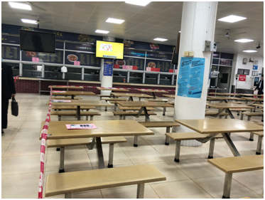 记者看到,校园的餐厅已不提供堂食,要求进入餐厅人员必须戴口罩、测量体温,实行打包带走制,无人员在餐厅集中用餐。