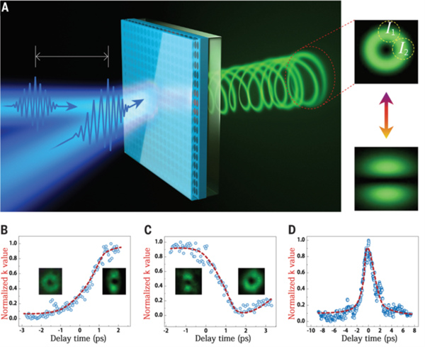 准BIC微型激光器的超快控制。(A)两束泵浦光的实验示意图。两个光束在空间d<2R处失谐,在时间上延迟了τ。插图显示了在对称和非对称激发下钙钛矿超表面的远场发射模式。(B)从BIC微型激光器到线性偏振激光器的过渡。 I1,2是插入物(A)中标记区域的强度。 插图显示了相应的光束轮廓。 (C)(B)的逆过程。 (D)从环形波束到旁瓣波束的转换,并在几皮秒内返回。红色曲线是过渡时间计算的引导线。