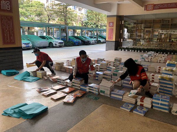 在校园之外,学校的教职工党员纷纷深入一线发挥“红马甲”力量,前往深圳大学城、南山区龙珠社区、宝安区新安社区等地协助开展复工复产和分发教材等志愿服务工作。“我在学校里工作,还是想为学生们做点事情。”教务部教职工党员张奥博通过线上APP报名参加了哈工大(深圳)实验学校的教材分发工作,协助打包中小学生新学期“线上课堂”教材。