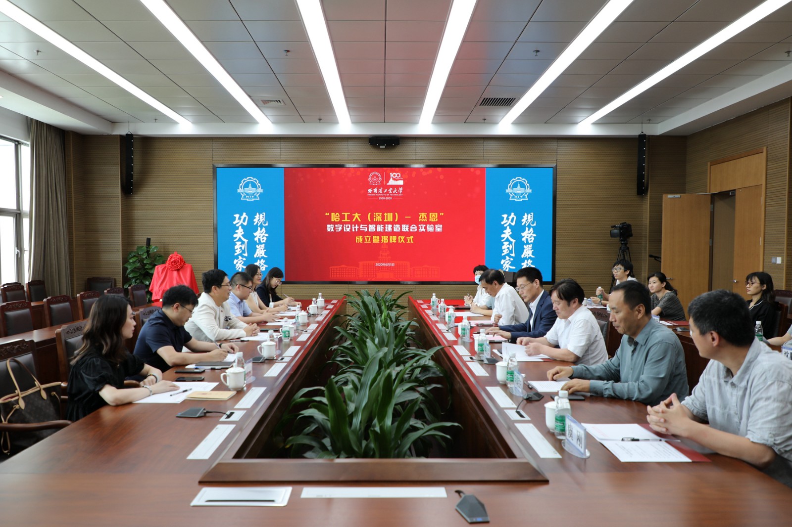 【哈工大(深圳)宣】(向碧霞/文、图)6月5日,“哈工大(深圳)- 杰恩”数字设计与智能建造联合实验室(以下简称联合实验室)正式成立。哈工大(深圳)常务副校长甄良与深圳市杰恩创意设计股份有限公司董事长、总经理、哈工大校友姜峰为联合实验室揭牌,校企合作添新篇。