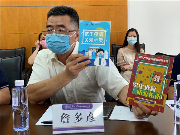清华大学深圳国际研究生院研工办副主任詹多彦向记者展示学生返校防疫指南