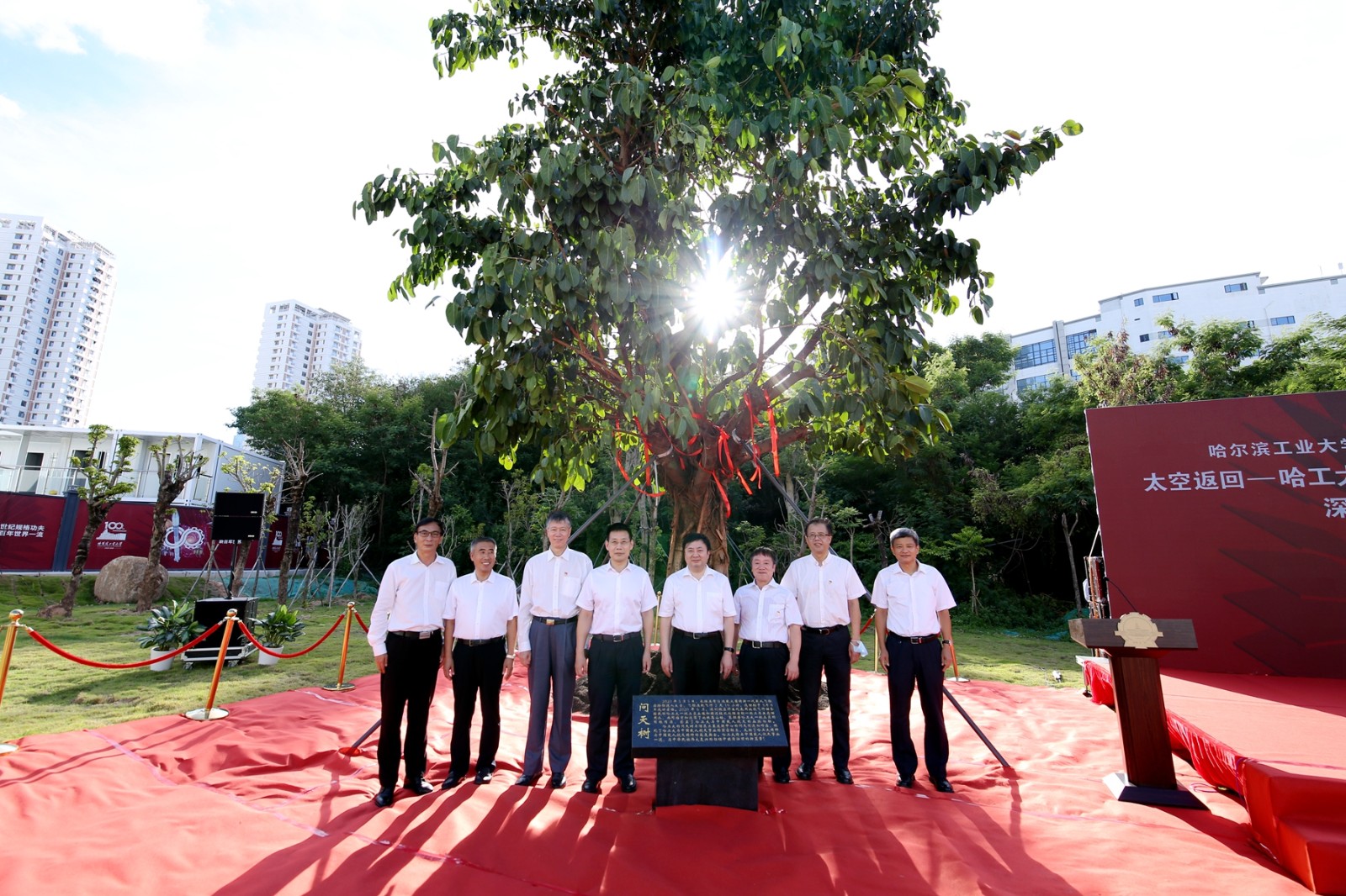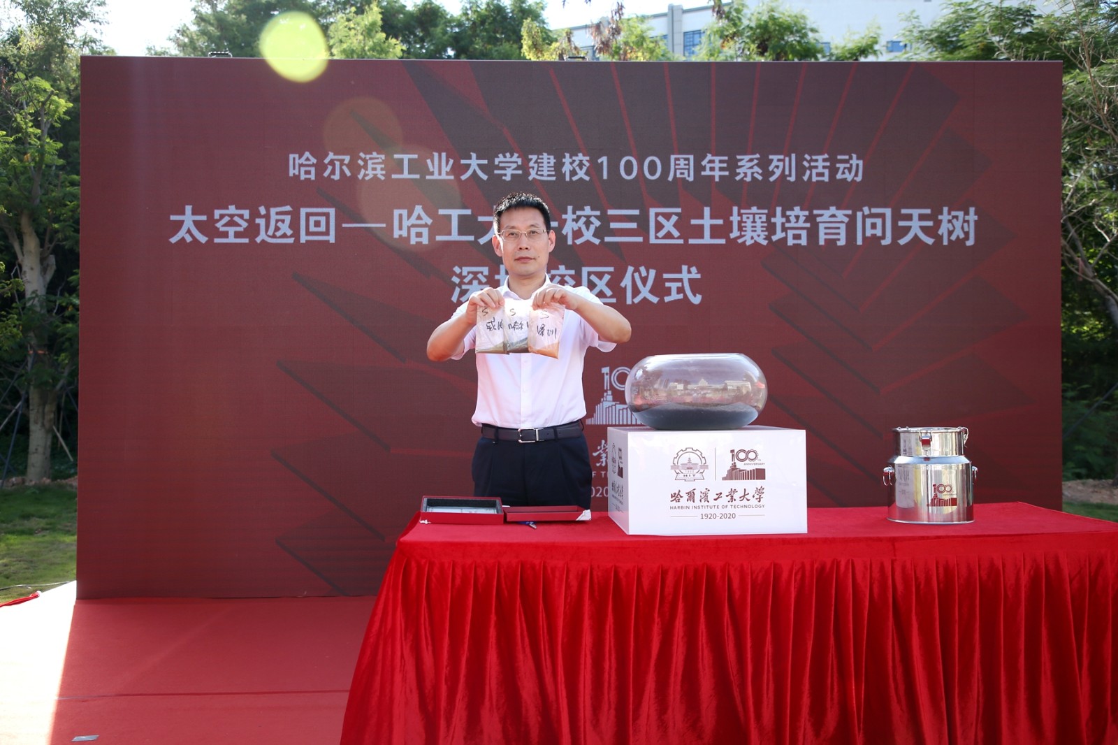 2019年12月,哈工大向中国载人航天工程办公室申请,取哈工大一校三区的土壤遨游太空。2020年5月5日,一校三区土壤融合,搭载发射的新一代载人飞船试验船,由长征五号B运载火箭在文昌航天发射场发射升空,飞船在轨飞行2天19小时,5月8日在东风着陆场成功着陆。6月7日校庆日当天,一校三区师生代表用从太空返回土壤在哈工大校本部共同培育一棵“问天树”。哈工大党委书记熊四皓、校长周玉分别为威海校区、深圳校区代表赠送太空返回土壤。哈工大(深圳)副校长姚英学作为深圳校区代表,从周玉校长手中接过这份珍贵的礼物,并带回至深圳校区。