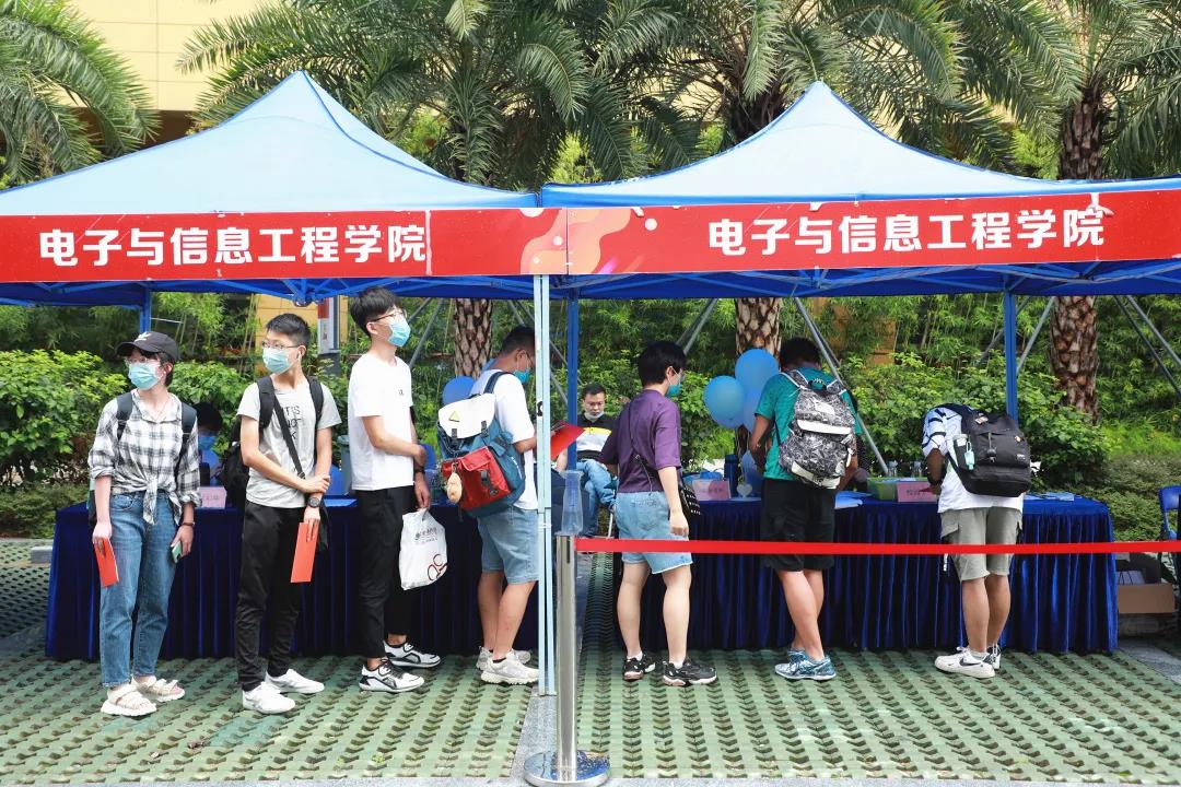 作为“生源大户”的计算机科学与技术学院设置了“加长版”迎新摊位,并设置了签名板,每一名新生都在上面签下自己的名字,仪式感满满地开启新旅途。电子与信息工程学院则提供了别样的“时光胶囊”,新生们在入学时要给四年后的自己写一封信,为美好的未来许下心愿。机电工程与自动化学院则为新生提供“一对一”服务,新生在入学前都会配备一位“专属”学长学姐进行全方位的线上指导,迎新现场不少新生直呼“奔现很亲切”。土木与环境工程学院则在现场放置了一个“迎新锣”,新生们在办妥入学手续后都以敲锣的形式为自己的全新征途加油鼓劲。材料科学与工程学院则为每名新同学发放写有名字的名片卡,并在上面附上了辅导员的联系方式,满满都是爱。建筑学院则为萌新准备了人手一份的“建面礼”,极富专业特色的笔记本和台历让同学们的归属感max,瞬间找到了“组织”。经济管理学院则在现场给同学带来了“专业第一课”,“看得见的手”和“看不见的手”尽显经管气质。理学院则别出心裁地种植了一颗“学院树”,“树叶”由每一名新生的手印组成,随着新生集结完毕,“大树”愈发茂盛,寓意着新生们在这里茁壮成长,孕育美好未来。