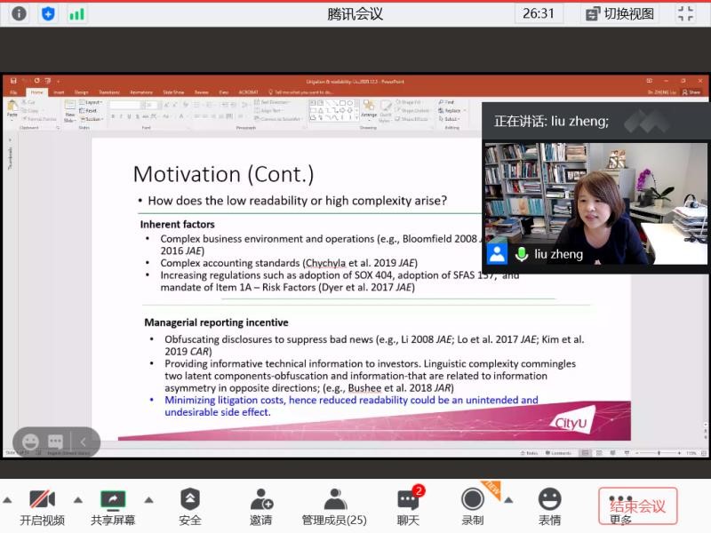 2020年12月3日,会计与财务学术论坛第26期线上开讲,香港城市大学会计系郑柳副教授作“‘天书’年报:诉讼风险的非预期后果”讲座,经管学院邬瑜骏老师主持,学院师生参与研讨。以下是讲座主要内容: