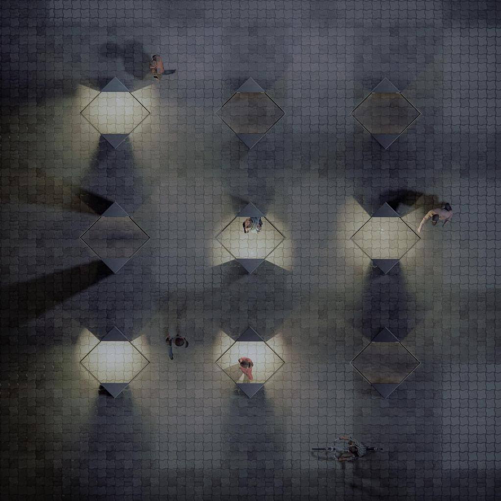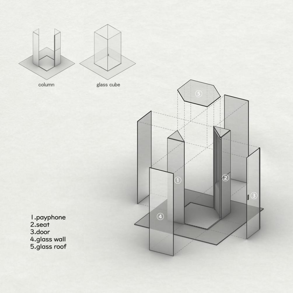 “解忧电话亭”设计作品是由“柱+玻璃立方体”阵列组成的3*3电话亭阵,其中“柱”承担了电话架以及座位的功能,玻璃立方体嵌入两个柱子中,使电话亭内外的活动能够相互被观察到。这种形态兼顾了严肃的纪念性,也具有一定的社区性和交互性。“一亭一人”的模式为居民提供表达情感的个人空间,也在疫情特殊时期使人们保持社交距离。电话亭收集了在新冠疫情中逝去者生前使用的电话号码,当逝者亲人拨打逝者的电话号码时,电话亭会做出发光响应,使路过的行人注意并前去接电话,倾听电话另一端的哀诉,为其分担忧思。