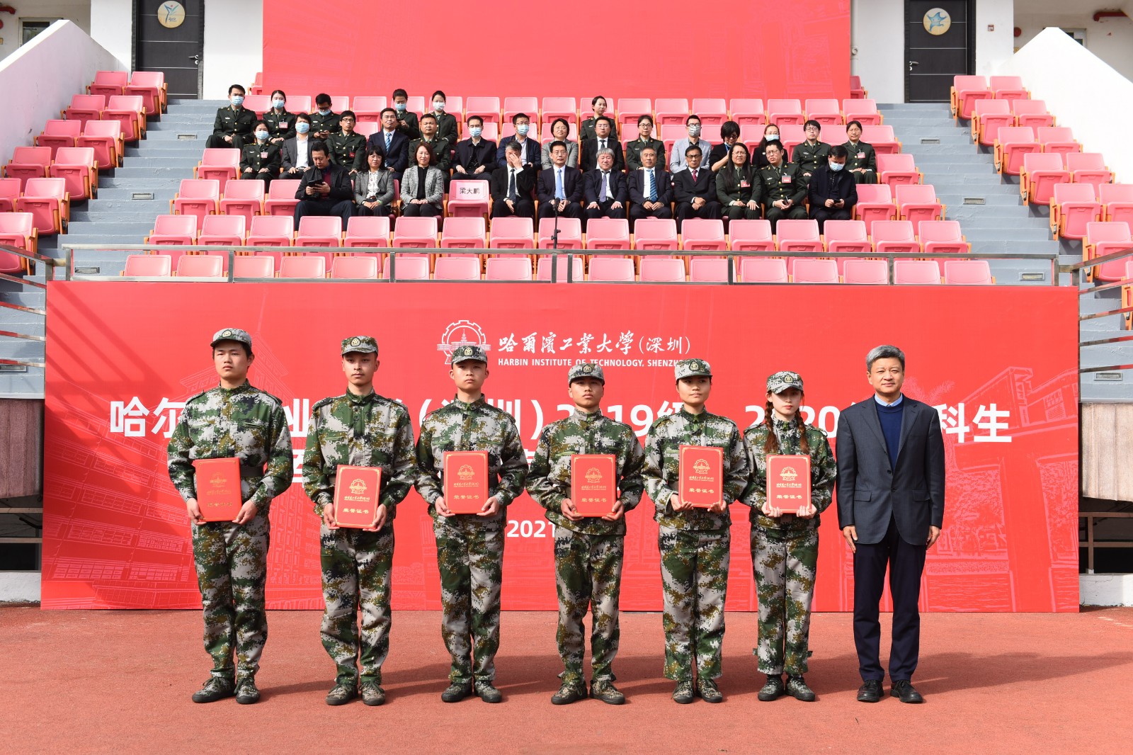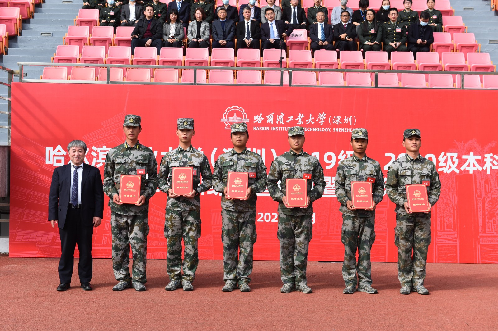 马广富宣读《哈尔滨工业大学(深圳)关于表彰2019级2020级本科生军训先进集体和优秀个人的决定》。授予国旗护卫队等7个单位先进集体荣誉称号;授予林浩边等15人优秀教官荣誉称号;授予李泽金等13人军训优秀工作者荣誉称号;授予张艾等33人优秀学员标兵荣誉称号;授予赵一锦等269人优秀学员荣誉称号。与会校领导为受表彰的先进集体和优秀个人颁奖。