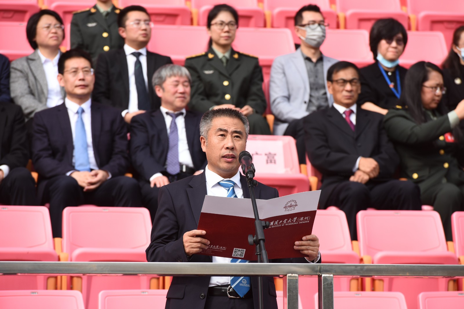 哈工大副校长、哈工大(深圳)常务副校长、学校军训工作领导小组组长甄良,哈工大(深圳)副校长、学校军训工作领导小组副组长姚英学,哈工大(深圳)校长助理、学校军训工作领导小组副组长韩喜双、马广富,深圳警备区党委常委、战备建设处处长、学校军训工作领导小组副组长李霄山,深圳警备区战备建设处参谋庞阔阔等参加大会。