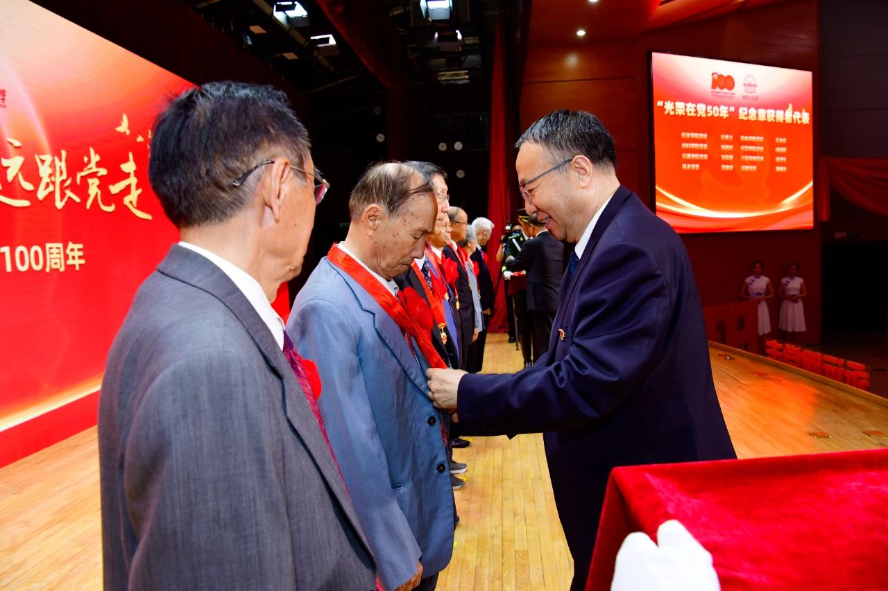 李健和周玉为哈工大“光荣在党50年”老党员代表航天学院党委杜善义、机电学院党委王永章、材料学院党委杨德庄、经管学院党委胡运权、交通学院党委刘景星、计算学部党委姚万生、机关党委周素珍、后勤党委魏栋先颁发“光荣在党50年”纪念章。全场响起持续而热烈的掌声。