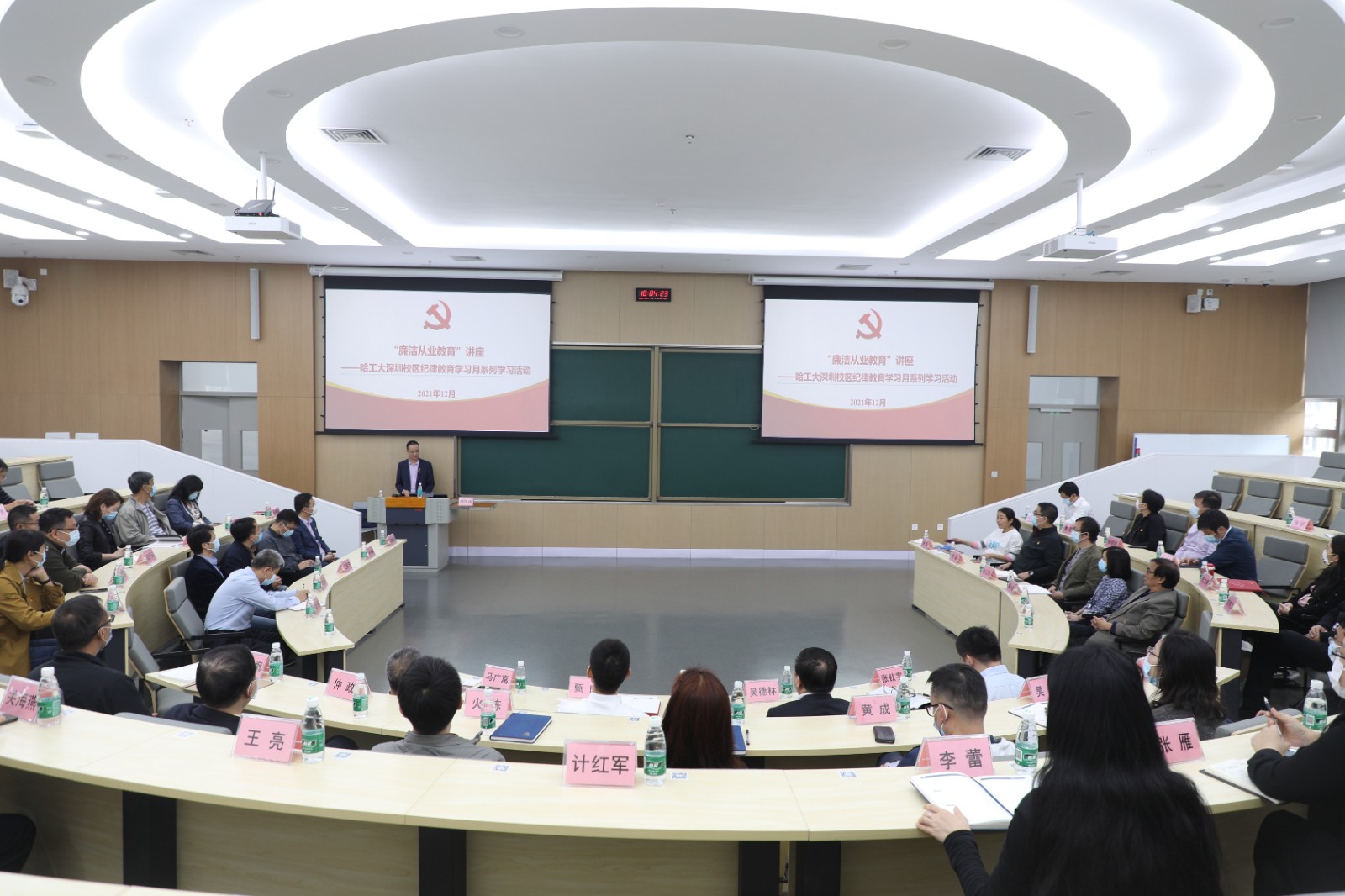 【哈工大(深圳)宣】(丁波皓/文、图)12月17日,哈工大(深圳)举办“廉洁从业教育”专题讲座,是纪律教育学习月的一项重要活动。深圳市纪委监委派驻第十一纪检监察组三级调研员蓝浩铭为中层以上领导干部做专题辅导报告。