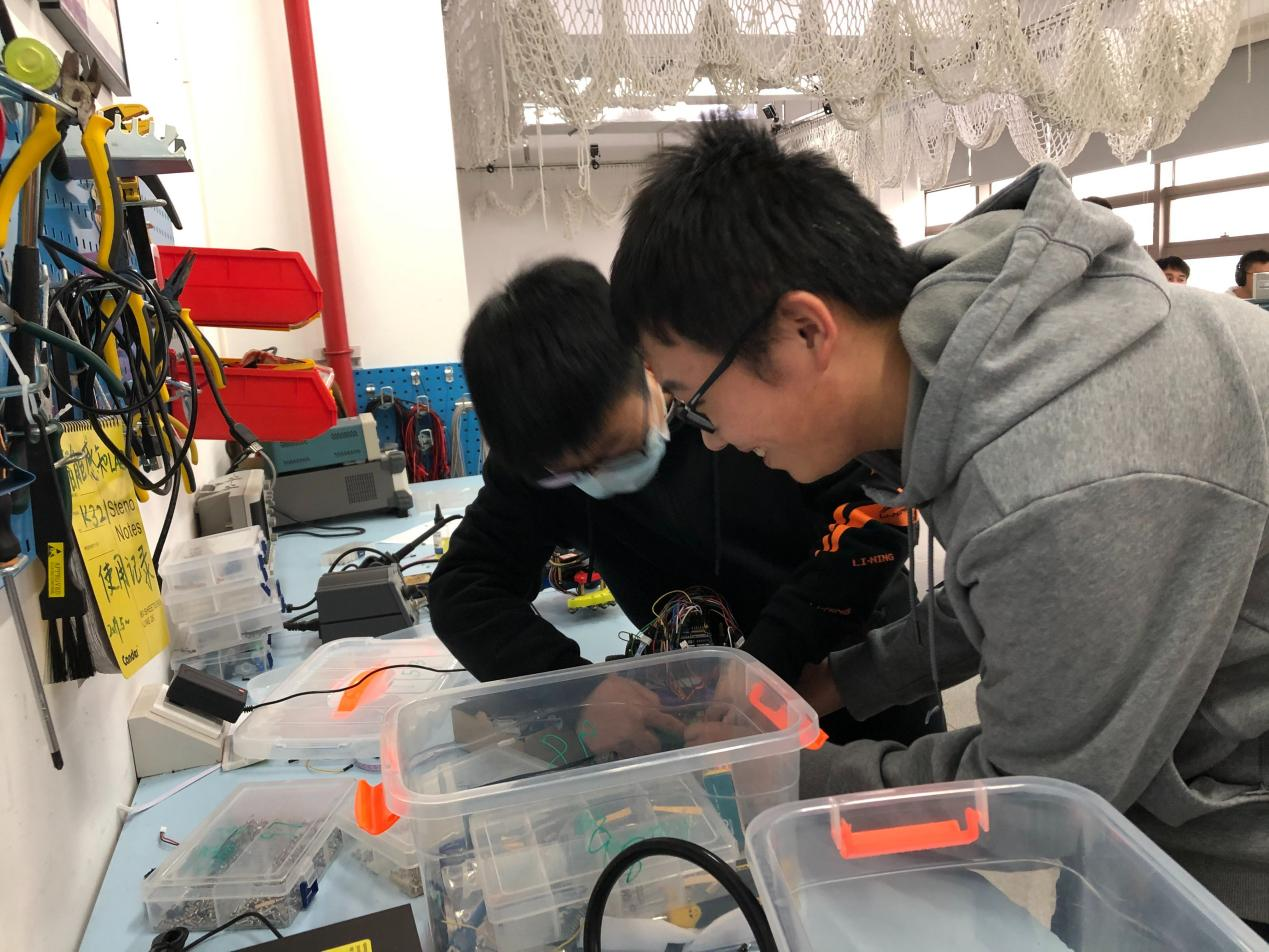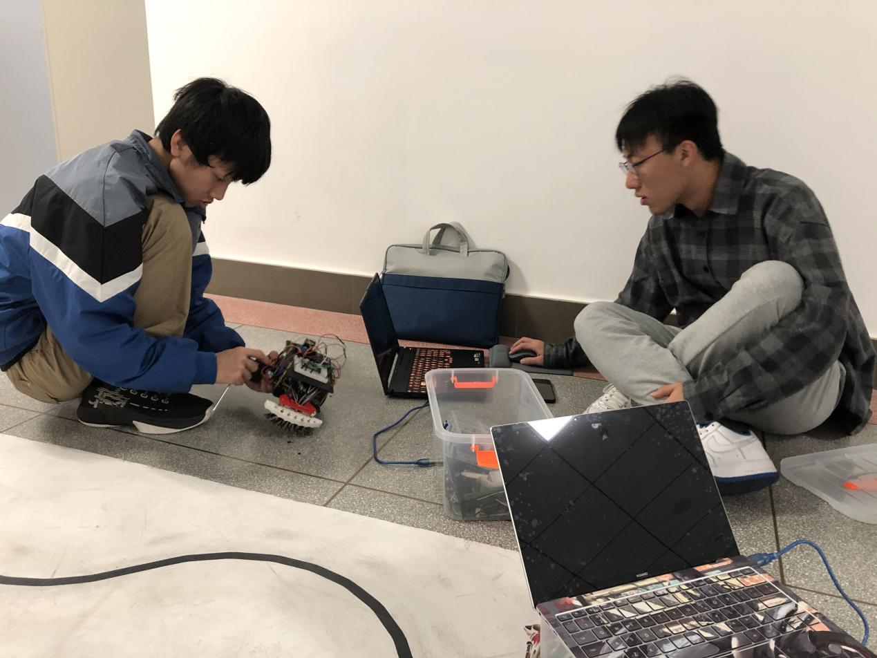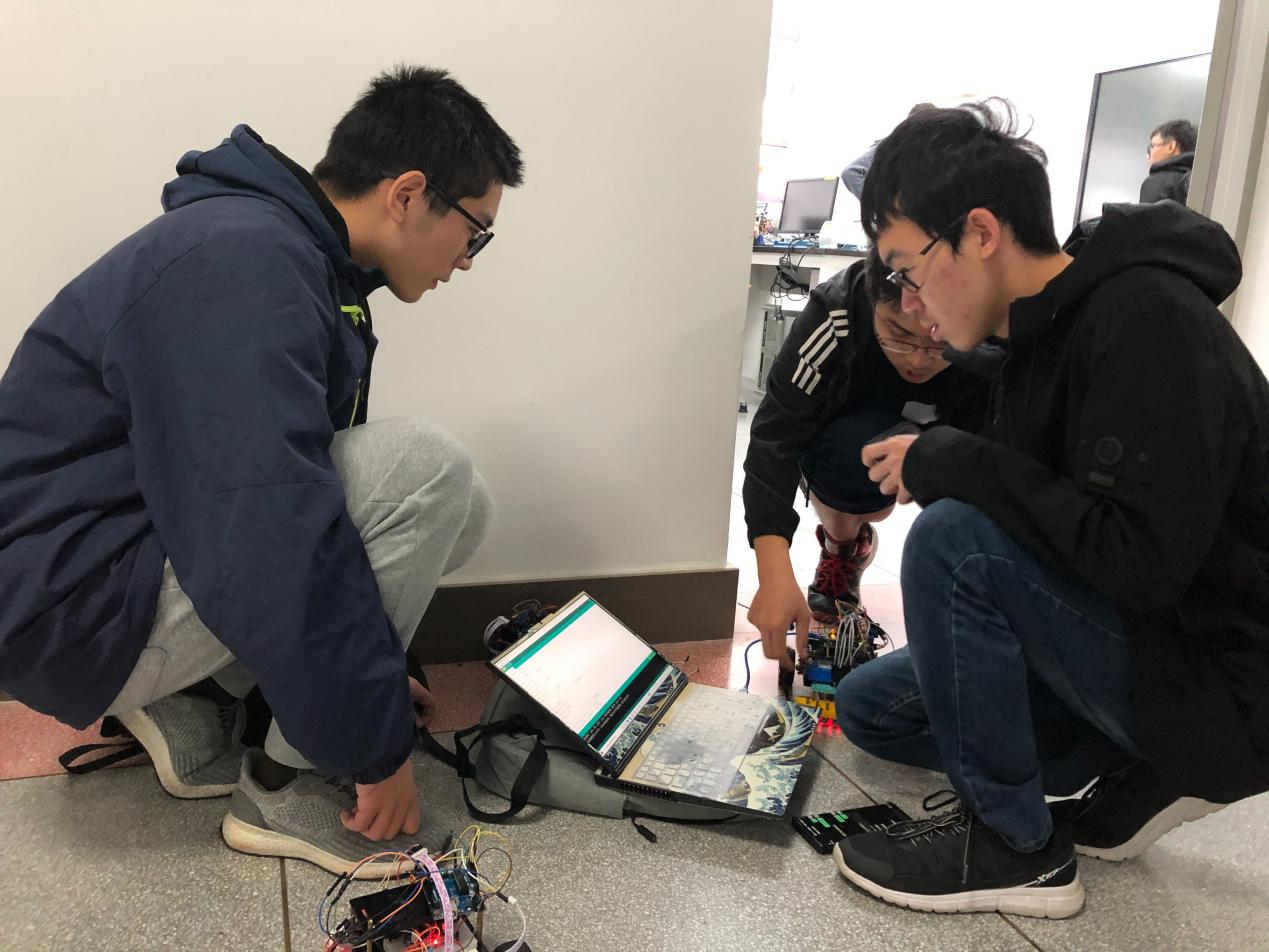 备受同学们关注的自动化机器人竞速赛,便是该课程的实验考查部分,比赛由任课老师黄瑞宁、陈浩耀、熊昊、熊小刚,实验老师葛亚明、李洪泉、宋金华以及全体助教担任评委。实验考察要求同学们在课程实验期间设计并搭建轮式机器人(以下简称“小车”),在指定赛道上实现循迹、过弯等功能。备赛期间,同学们集思广益,解决了包括元器件失灵、小车失控、参数失效等问题,同时不断调试参数、优化算法,持续提高小车的性能,在实践中追求卓越。
