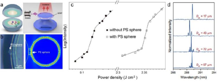 团队将该材料与高Q值(2×105)的片上微环激光器件相集成以进行光学表征,首次观察到了Er3+敏化的强深紫外上转换激光辐射,该多米诺上转换过程促进下的Tm3+离子五光子上转换辐射对激光腔的Q值因子很敏感,并以尺寸近似的聚苯乙烯小球模拟癌细胞分泌物进行了传感测量,可以通过监测290纳米激光阈值变化实现纳米颗粒传感,传感尺寸小至300纳米。