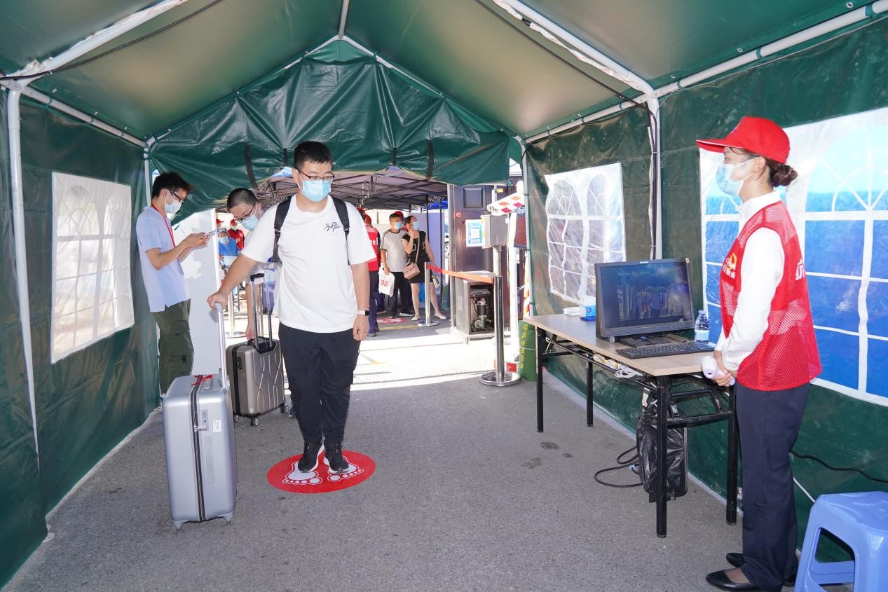 暖心迎新已成为哈工大(深圳)的标准底色。在各报到点,新生和志愿者、工作人员总会上演一幕幕让人感动的“双向奔赴”。新生们按照引导标识分通道排队进入候检区,经过检测体温、核验绿码、查看录取通知书等环节,便可以“通关”了。