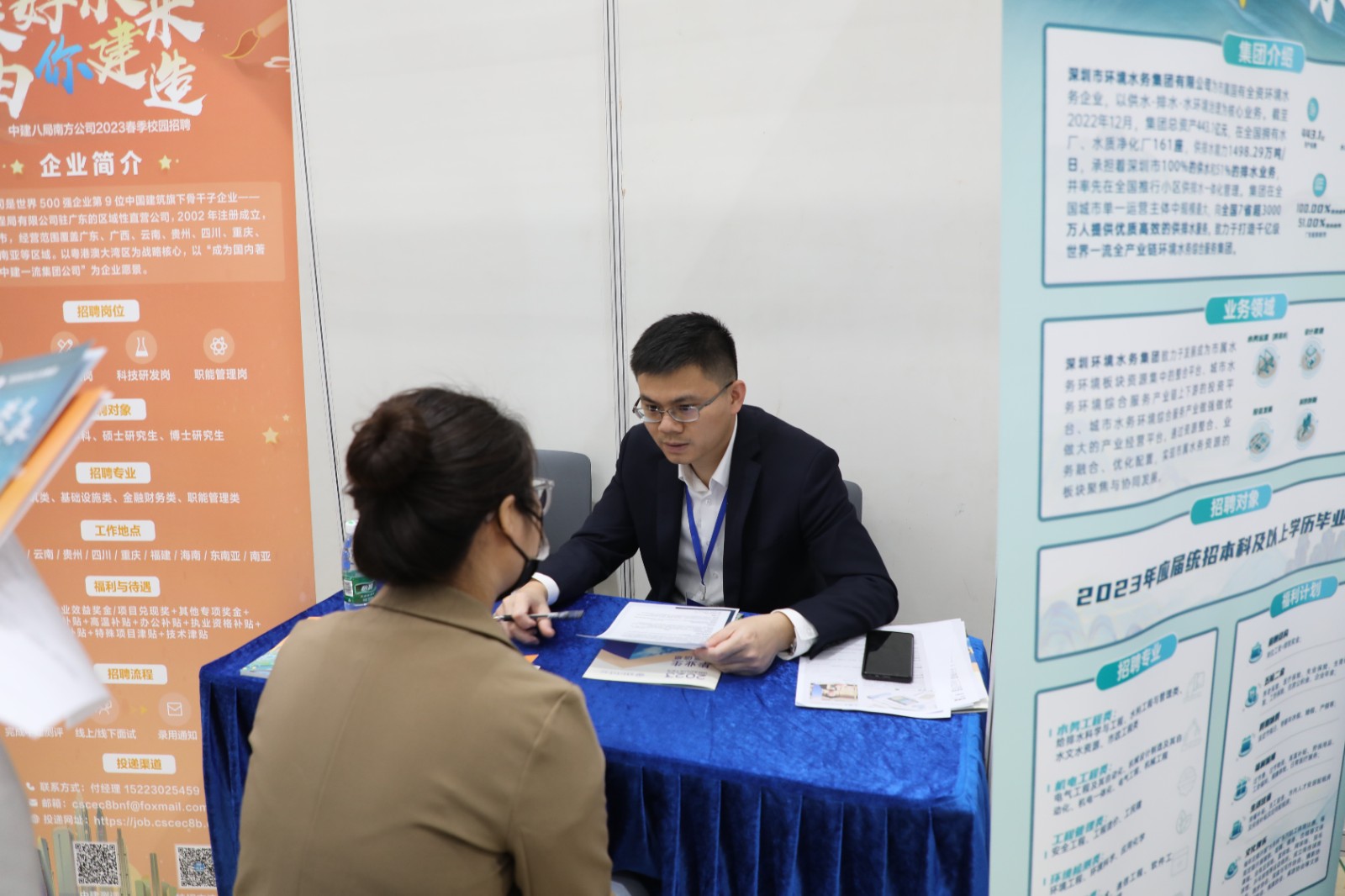 各个摊位前“人头攒动”。毕业生们与重点用人单位一对一交流,不仅了解岗位适配度,还深入交流行业变化和发展。2023届毕业生曾同学早早来到了双选会现场,她已经向多个心仪单位投递了简历,“今天双选会来的企业都很优质,不仅有专业对口的企业,也有很多愿意接受我想跨专业就业需求的企业,选择很多、很丰富。”曾同学说,用人单位都很热情,会根据她的情况推荐合适岗位,也会给她分析行业未来发展方向,让她对行业前景有了更多的认识。
