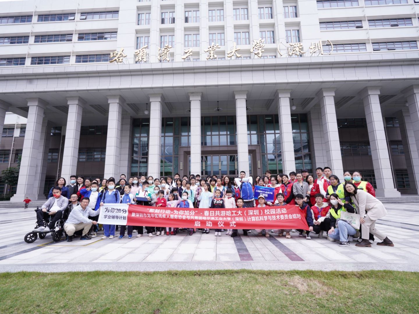 【哈工大(深圳)宣】(计算机科学与技术学院 文/图)4月1日,龙华区17个残障儿童家庭走进哈工大深圳校区,开展“即刻行动·为你加分”春日共游校园活动。活动期间,龙华区残疾人服务协会与校区计算机科学与技术学院团委结对共建,计算机学院“即刻行动”志愿队带领特殊的孩子们共游春日校园,为他们送上了哥哥姐姐们的关怀与温暖,为他们的生活“加点糖”。