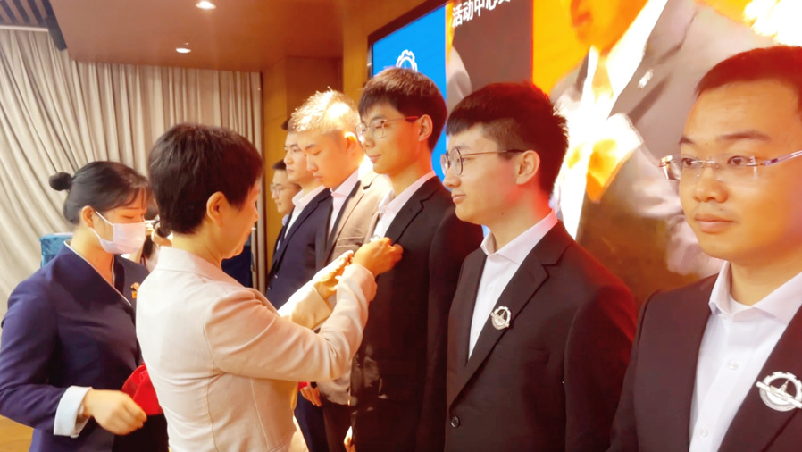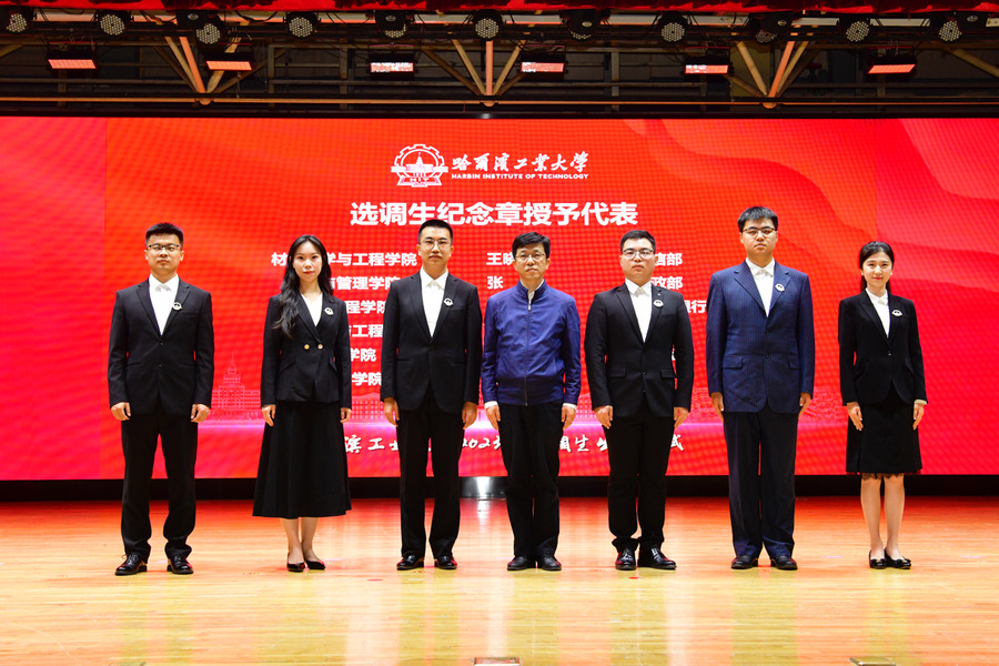 校党委常委、组织部部长李明江,威海校区党委书记张淑娣,深圳校区党委副书记张国宏为一校三区选调生代表佩戴哈工大选调生纪念章。