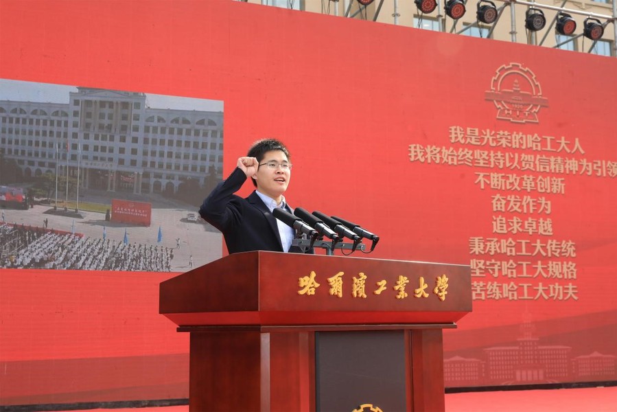 “我是光荣的哈工大人,我将始终坚持以贺信精神为引领,不断改革创新、奋发作为、追求卓越……”在李蕴洲同学领誓下,全体学生庄严宣誓。