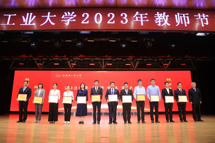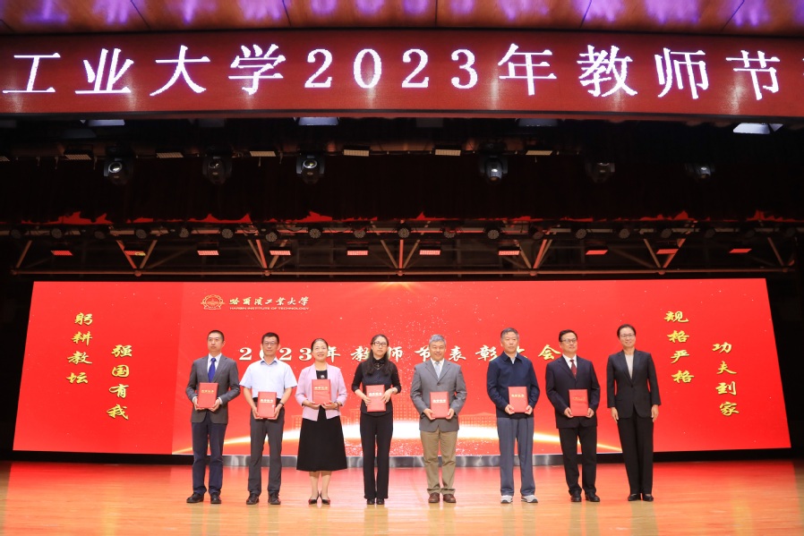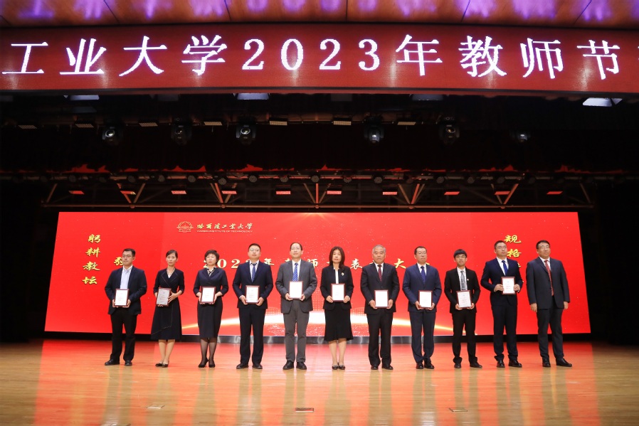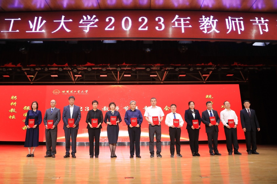 哈工大全媒体(梁英爽/文 辛然 隗海燕 吴锐婵/图)在第39个教师节即将到来之际,主题为“躬耕教坛 强国有我”的哈工大2023年教师节表彰大会于9月8日下午在活动中心301举行。校党委书记熊四皓为教职工代表颁授“功夫锤”,并与校长韩杰才共同为退休教职工代表颁发荣休纪念牌、佩戴荣休纪念围巾。韩杰才在会上讲话。