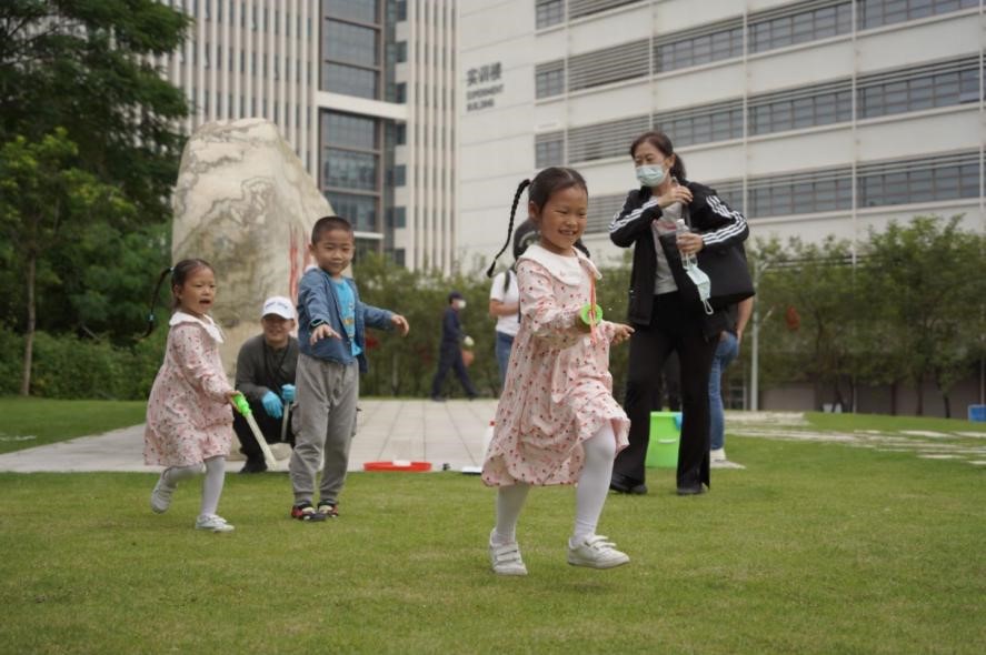 在校训石前,大家一同参与化学趣味实验“更大的泡泡”,现场其乐融融。空中飘着五彩斑斓的泡泡,“哈工大”与“青少年”的故事精彩纷呈。