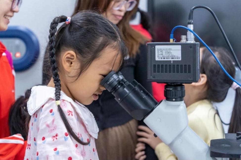 在大学生志愿者的带领下,中小学生参观了荔园食堂、学生宿舍与各栋教学楼。大家“大手拉小手”,一路看,一路聊,一同感受大学生活的魅力。在实验与创新实践教育中心,中小学生观看了无人机飞行表演,现场发出阵阵惊叹之声。
